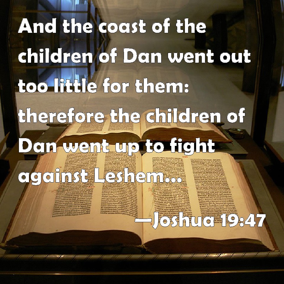 Choose a Background Joshua 19:47 And the coast of the children of Dan went out too little for them: therefore the children of Dan went up to fight against Leshem, and took it, and smote it with the edge of the sword, and possessed it, and dwelled therein, and called Leshem, Dan, after the name of Dan their father. KJV: And the coast of the children of Dan went out too little for them: therefore the children of Dan went up to fight against Leshem, and took it, and smote it with the edge of the sword, and possessed it, and dwelt therein, and called Leshem, Dan, after the name of Dan their father. DRB: And is terminated there. And the children of Dan went up and fought against Lesem, and took it: and they put it to the sword, and possessed it, and dwelt in it, calling the name of it Lesem Dan, by the name of Dan their father. DBT: And the border of the children of Dan ended with these; and the children of Dan went up and fought against Leshem, and took it, and smote it with the edge of the sword, and took possession of it, and dwelt in it, and called Leshem, Dan, after the name of Dan their father. ERV: And the border of the children of Dan went out beyond them: for the children of Dan went up and fought against Leshem, and took it, and smote it with the edge of the sword, and possessed it, and dwelt therein, and called Leshem, Dan, after the name of Dan their father. WBT: And the border of the children of Dan, went out too little for them: therefore the children of Dan went up to fight against Leshem, and took it, and smote it with the edge of the sword, and possessed it, and dwelt in it, and called Leshem, Dan, after the name of Dan their father. WEB: The border of the children of Dan went out beyond them; for the children of Dan went up and fought against Leshem, and took it, and struck it with the edge of the sword, and possessed it, and lived therein, and called Leshem, Dan, after the name of Dan their father. YLT: And the border of the sons of Dan goeth out from them, and the sons of Dan go up and fight with Leshem, and capture it, and smite it by the mouth of the sword, and possess it, and dwell in it, and call Leshem, Dan, according to the name of Dan their father.Links Joshua 19:47 NIV • Joshua 19:47 NLT • Joshua 19:47 ESV • Joshua 19:47 NASB • Joshua 19:47 KJV • Joshua 19:47 Interlinear • Joshua 19:47 Commentaries • Joshua 19:47 Parallel Texts • Joshua 19:47 Bible Apps • Joshua 19:47 Parallel • Bible Hub |