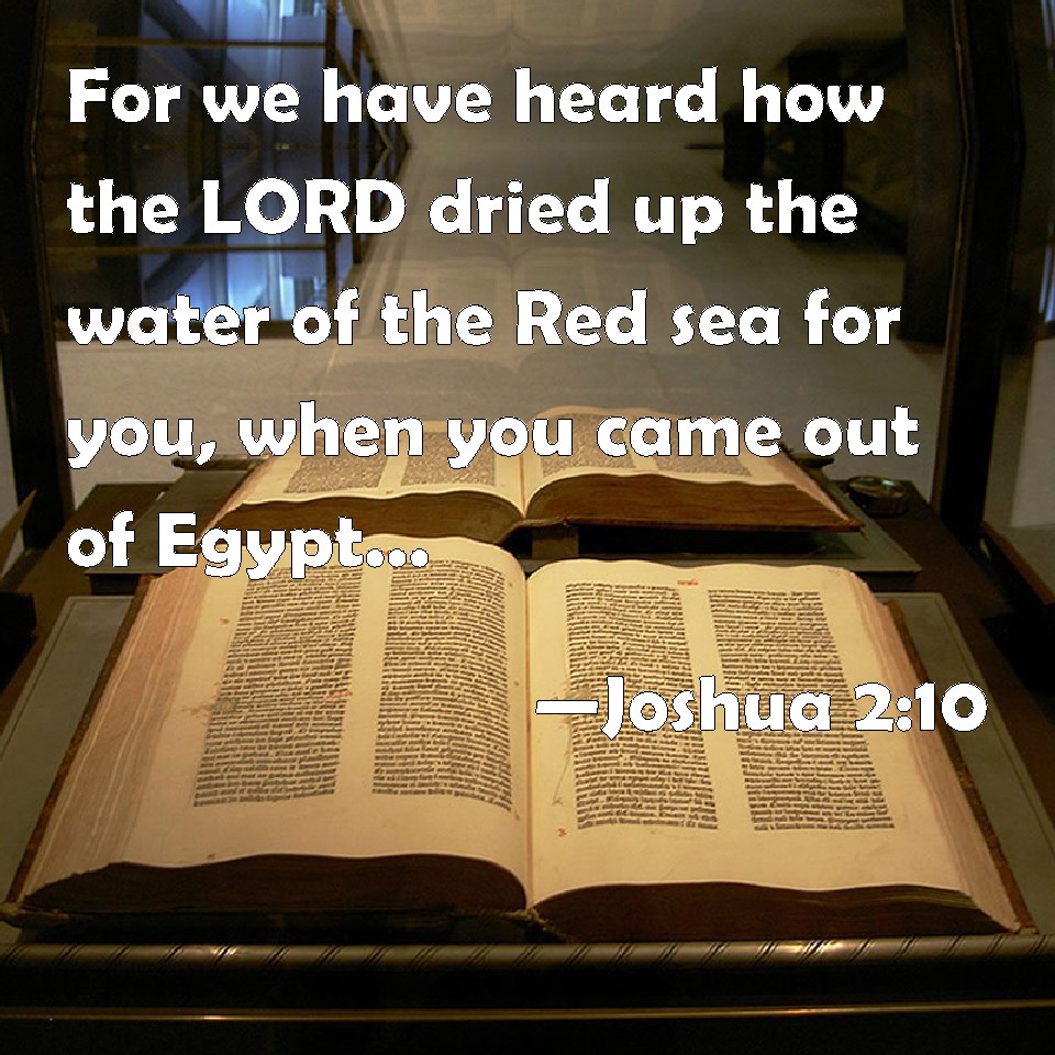 Choose a Background Joshua 2:10 For we have heard how the LORD dried up the water of the Red sea for you, when you came out of Egypt; and what you did to the two kings of the Amorites, that were on the other side Jordan, Sihon and Og, whom you utterly destroyed. KJV: For we have heard how the LORD dried up the water of the Red sea for you, when ye came out of Egypt; and what ye did unto the two kings of the Amorites, that were on the other side Jordan, Sihon and Og, whom ye utterly destroyed. DRB: We have heard that the Lord dried up the water of the Red Sea at your going in, when you came out of Egypt: and what things you did to the two kings of the Amorrhites, that were beyond the Jordan: Sehon and Og whom you slew. DBT: For we have heard that Jehovah dried up the waters of the Red sea before you when ye came out of Egypt; and what ye did to the two kings of the Amorites that were beyond the Jordan, to Sihon and to Og, whom ye utterly destroyed. ERV: For we have heard how the LORD dried up the water of the Red Sea before you, when ye came out of Egypt; and what ye did unto the two kings of the Amorites, that were beyond Jordan, unto Sihon and to Og, whom ye utterly destroyed. WBT: For we have heard how the LORD dried up the water of the Red sea for you, when ye came out of Egypt; and what ye did to the two kings of the Amorites, that were on the other side of Jordan, Sihon and Og, whom ye utterly destroyed. WEB: For we have heard how Yahweh dried up the water of the Red Sea before you, when you came out of Egypt; and what you did to the two kings of the Amorites, who were beyond the Jordan, to Sihon and to Og, whom you utterly destroyed. YLT: For we have heard how Jehovah dried up the waters of the Red Sea at your presence, in your going out of Egypt, and that which ye have done to the two kings of the Amorite who are beyond the Jordan; to Sihon and to Og whom ye devoted.Links Joshua 2:10 NIV • Joshua 2:10 NLT • Joshua 2:10 ESV • Joshua 2:10 NASB • Joshua 2:10 KJV • Joshua 2:10 Interlinear • Joshua 2:10 Commentaries • Joshua 2:10 Parallel Texts • Joshua 2:10 Bible Apps • Joshua 2:10 Parallel • Bible Hub |