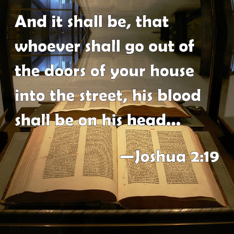 Choose a Background Joshua 2:19 And it shall be, that whoever shall go out of the doors of your house into the street, his blood shall be on his head, and we will be guiltless: and whoever shall be with you in the house, his blood shall be on our head, if any hand be on him. KJV: And it shall be, that whosoever shall go out of the doors of thy house into the street, his blood shall be upon his head, and we will be guiltless: and whosoever shall be with thee in the house, his blood shall be on our head, if any hand be upon him. DRB: Whosoever shall go out of the door of thy house, his blood shall be upon his own head, and we shall be quit. But the blood of all that shall be with thee in the house, shall light upon our head, if any man touch them. DBT: and it shall be, that whoever shall go out of the doors of thy house into the street, his blood shall be upon his head, and we shall be innocent; but every one who shall be with thee in the house, his blood shall be upon our head, if any hand be upon him. ERV: And it shall be, that whosoever shall go out of the doors of thy house into the street, his blood shall be upon his head, and we will be guiltless: and whosoever shall be with thee in the house, his blood shall be on our head, if any hand be upon him. WBT: And it shall be, that whoever shall go out of the doors of thy house into the street, his blood shall be upon his head, and we will be guiltless: and whoever shall be with thee in the house, his blood shall be on our head, if any hand be upon him. WEB: It shall be that whoever goes out of the doors of your house into the street, his blood will be on his head, and we will be guiltless. Whoever is with you in the house, his blood shall be on our head, if any hand is on him. YLT: and it hath been, any one who goeth out from the doors of thy house without, his blood is on his head, and we are innocent; and any one who is with thee in the house, his blood is on our head, if a hand is on him;Links Joshua 2:19 NIV • Joshua 2:19 NLT • Joshua 2:19 ESV • Joshua 2:19 NASB • Joshua 2:19 KJV • Joshua 2:19 Interlinear • Joshua 2:19 Commentaries • Joshua 2:19 Parallel Texts • Joshua 2:19 Bible Apps • Joshua 2:19 Parallel • Bible Hub |
