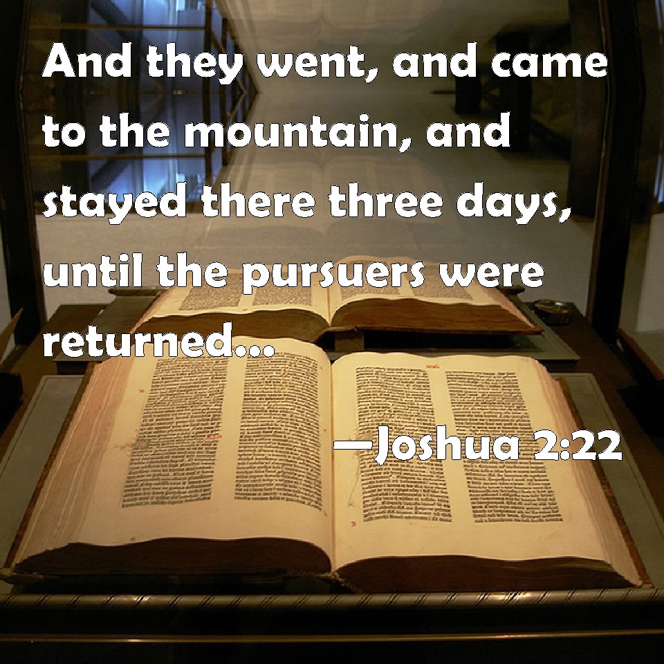 Choose a Background Joshua 2:22 And they went, and came to the mountain, and stayed there three days, until the pursuers were returned: and the pursuers sought them throughout all the way, but found them not. KJV: And they went, and came unto the mountain, and abode there three days, until the pursuers were returned: and the pursuers sought them throughout all the way, but found them not. DRB: But they went and came to the mountains, and stayed there three days till they that pursued them were returned. For having sought them through all the way, they found them not. DBT: And they went, and came to the mountain, and remained there three days, until the pursuers had returned; and the pursuers sought them all the way, and found them not. ERV: And they went, and came unto the mountain, and abode there three days, until the pursuers were returned: and the pursuers sought them throughout all the way, but found them not. WBT: And they went, and came to the mountain, and abode there three days, until the pursuers had returned: and the pursuers sought them throughout all the way, but found them not. WEB: They went, and came to the mountain, and stayed there three days, until the pursuers had returned. The pursuers sought them throughout all the way, but didn't find them. YLT: And they go, and come in to the mountain, and abide there three days until the pursuers have turned back; and the pursuers seek in all the way, and have not found.Links Joshua 2:22 NIV • Joshua 2:22 NLT • Joshua 2:22 ESV • Joshua 2:22 NASB • Joshua 2:22 KJV • Joshua 2:22 Interlinear • Joshua 2:22 Commentaries • Joshua 2:22 Parallel Texts • Joshua 2:22 Bible Apps • Joshua 2:22 Parallel • Bible Hub |