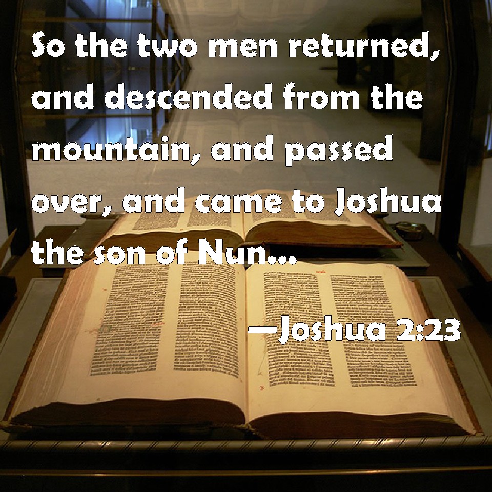 Choose a Background Joshua 2:23 So the two men returned, and descended from the mountain, and passed over, and came to Joshua the son of Nun, and told him all things that befell them: KJV: So the two men returned, and descended from the mountain, and passed over, and came to Joshua the son of Nun, and told him all things that befell them: DRB: And when they were gone back into the city, the spies returned, and came down from the mountain: and passing over the Jordan, they came to Josue the son of Nun, and told him all that befel them. DBT: And the two men returned and came down from the mountain, and went over and came to Joshua the son of Nun, and related to him everything that had happened to them. ERV: Then the two men returned, and descended from the mountain, and passed over, and came to Joshua the son of Nun; and they told him all that had befallen them. WBT: So the two men returned, and descended from the mountain, and passed over, and came to Joshua the son of Nun, and told him all things that befell them: WEB: Then the two men returned, descended from the mountain, passed over, and came to Joshua the son of Nun; and they told him all that had happened to them. YLT: And the two men turn back, and come down from the hill, and pass over, and come in unto Joshua son of Nun, and recount to him all that hath come upon them;Links Joshua 2:23 NIV • Joshua 2:23 NLT • Joshua 2:23 ESV • Joshua 2:23 NASB • Joshua 2:23 KJV • Joshua 2:23 Interlinear • Joshua 2:23 Commentaries • Joshua 2:23 Parallel Texts • Joshua 2:23 Bible Apps • Joshua 2:23 Parallel • Bible Hub |