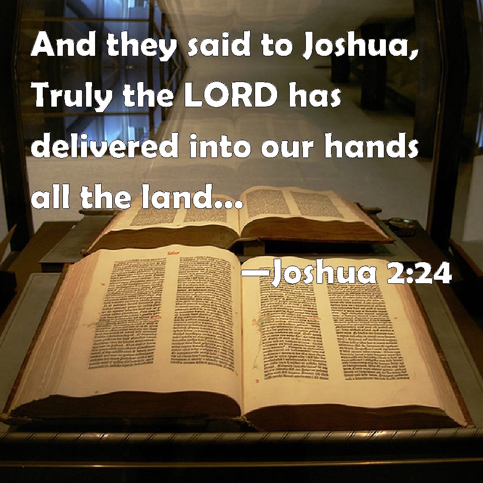 Choose a Background Joshua 2:24 And they said to Joshua, Truly the LORD has delivered into our hands all the land; for even all the inhabitants of the country do faint because of us. KJV: And they said unto Joshua, Truly the LORD hath delivered into our hands all the land; for even all the inhabitants of the country do faint because of us. DRB: And said: The Lord hath delivered all this land into our hands, and all the inhabitants thereof are overthrown with fear. DBT: And they said to Joshua, Of a surety Jehovah has given the whole land into our hands, and even all the inhabitants of the land faint because of us. ERV: And they said unto Joshua, Truly the LORD hath delivered into our hands all the land; and moreover all the inhabitants of the land do melt away before us. WBT: And they said to Joshua, Truly the LORD hath delivered into our hands all the land; for even all the inhabitants of the country do faint because of us. WEB: They said to Joshua, "Truly Yahweh has delivered into our hands all the land. Moreover, all the inhabitants of the land melt away before us." YLT: and they say unto Joshua, 'Surely Jehovah hath given into our hand all the land; and also, all the inhabitants of the land have melted at our presence.'Links Joshua 2:24 NIV • Joshua 2:24 NLT • Joshua 2:24 ESV • Joshua 2:24 NASB • Joshua 2:24 KJV • Joshua 2:24 Interlinear • Joshua 2:24 Commentaries • Joshua 2:24 Parallel Texts • Joshua 2:24 Bible Apps • Joshua 2:24 Parallel • Bible Hub |