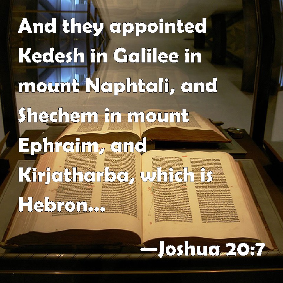 Choose a Background Joshua 20:7 And they appointed Kedesh in Galilee in mount Naphtali, and Shechem in mount Ephraim, and Kirjatharba, which is Hebron, in the mountain of Judah. KJV: And they appointed Kedesh in Galilee in mount Naphtali, and Shechem in mount Ephraim, and Kirjatharba, which is Hebron, in the mountain of Judah. DRB: And they appointed Cedes in Galilee of mount Nephtali, and Sichem in mount Ephraim, and Cariath-Arbe, the same is Hebron in the mountain of Juda. DBT: And they hallowed Kedesh in Galilee in the hill-country of Naphtali, and Shechem in the hill-country of Ephraim, and Kirjath-Arba, that is, Hebron, in the hill-country of Judah. ERV: And they set apart Kedesh in Galilee in the hill country of Naphtali, and Shechem in the hill country of Ephraim, and Kiriath-arba (the same is Hebron) in the hill country of Judah. WBT: And they appointed Kedesh in Galilee in mount Naphtali, and Shechem in mount Ephraim, and Kirjath-arba, (which is Hebron) in the mountain of Judah. WEB: They set apart Kedesh in Galilee in the hill country of Naphtali, Shechem in the hill country of Ephraim, and Kiriath Arba (the same is Hebron) in the hill country of Judah. YLT: And they sanctify Kedesh in Galilee, in the hill-country of Naphtali, and Shechem in the hill-country of Ephraim, and Kirjath-Arba (it is Hebron), in the hill-country of Judah;Links Joshua 20:7 NIV • Joshua 20:7 NLT • Joshua 20:7 ESV • Joshua 20:7 NASB • Joshua 20:7 KJV • Joshua 20:7 Interlinear • Joshua 20:7 Commentaries • Joshua 20:7 Parallel Texts • Joshua 20:7 Bible Apps • Joshua 20:7 Parallel • Bible Hub |