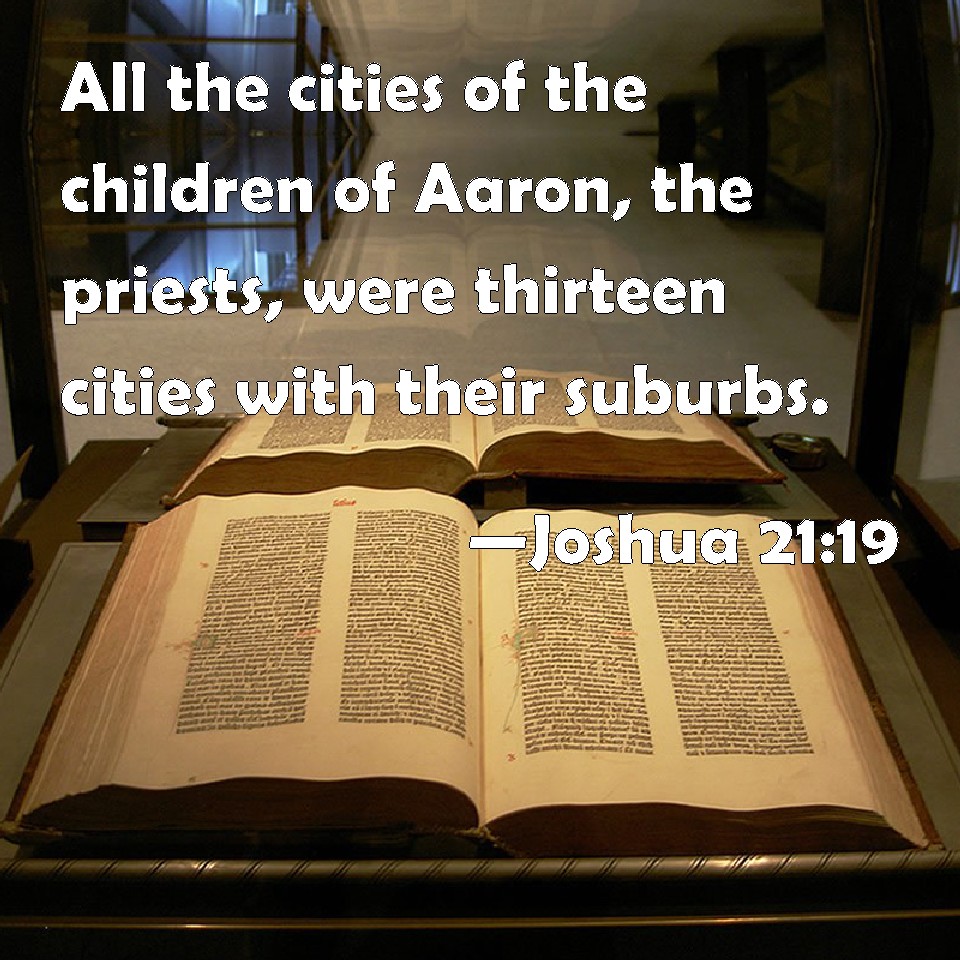 Choose a Background Joshua 21:19 All the cities of the children of Aaron, the priests, were thirteen cities with their suburbs. KJV: All the cities of the children of Aaron, the priests, were thirteen cities with their suburbs. DRB: All the cities together of the children of Aaron the priest, were thirteen, with their suburbs. DBT: All the cities of the children of Aaron, the priests, were thirteen cities and their suburbs. ERV: All the cities of the children of Aaron, the priests, were thirteen cities with their suburbs. WBT: All the cities of the children of Aaron, the priests, were thirteen cities with their suburbs. WEB: All the cities of the children of Aaron, the priests, were thirteen cities with their suburbs. YLT: all the cities of the sons of Aaron the priests, are thirteen cities and their suburbs.Links Joshua 21:19 NIV • Joshua 21:19 NLT • Joshua 21:19 ESV • Joshua 21:19 NASB • Joshua 21:19 KJV • Joshua 21:19 Interlinear • Joshua 21:19 Commentaries • Joshua 21:19 Parallel Texts • Joshua 21:19 Bible Apps • Joshua 21:19 Parallel • Bible Hub |
