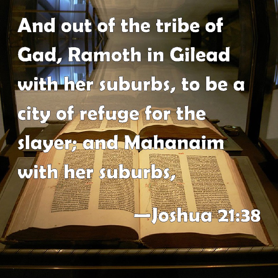 Choose a Background Joshua 21:38 And out of the tribe of Gad, Ramoth in Gilead with her suburbs, to be a city of refuge for the slayer; and Mahanaim with her suburbs, KJV: And out of the tribe of Gad, Ramoth in Gilead with her suburbs, to be a city of refuge for the slayer; and Mahanaim with her suburbs, DRB: Of the tribe of Gad, Ramoth in Galaad, one of the cities of refuge, and Manaim DBT: and out of the tribe of Gad, the city of refuge for the slayer, Ramoth in Gilead and its suburbs; and Mahanaim and its suburbs, ERV: And out of the tribe of Gad, Ramoth in Gilead with her suburbs, the city of refuge for the manslayer, and Mahanaim with her suburbs; WBT: And out of the tribe of Gad, Ramoth in Gilead with its suburbs to be a city of refuge for the slayer; and Mahanaim with its suburbs, WEB: Out of the tribe of Gad, Ramoth in Gilead with its suburbs, the city of refuge for the manslayer, and Mahanaim with its suburbs, YLT: And out of the tribe of Gad, the city of refuge for the man-slayer, Ramoth in Gilead and its suburbs, and Mahanaim and its suburbs,Links Joshua 21:38 NIV • Joshua 21:38 NLT • Joshua 21:38 ESV • Joshua 21:38 NASB • Joshua 21:38 KJV • Joshua 21:38 Interlinear • Joshua 21:38 Commentaries • Joshua 21:38 Parallel Texts • Joshua 21:38 Bible Apps • Joshua 21:38 Parallel • Bible Hub |