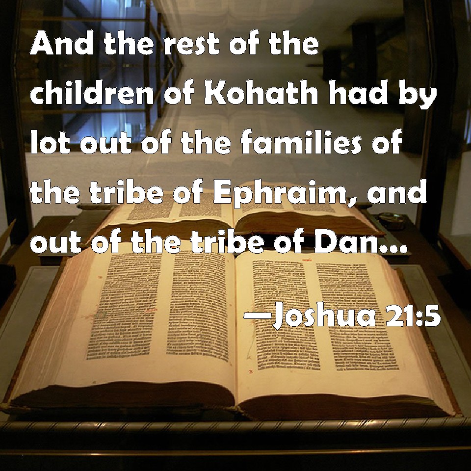 Choose a Background Joshua 21:5 And the rest of the children of Kohath had by lot out of the families of the tribe of Ephraim, and out of the tribe of Dan, and out of the half tribe of Manasseh, ten cities. KJV: And the rest of the children of Kohath had by lot out of the families of the tribe of Ephraim, and out of the tribe of Dan, and out of the half tribe of Manasseh, ten cities. DRB: And to the rest of the children of Caath, that is, to the Levites, who remained, out of the tribes of Ephraim, and of Dan, and the half tribe of Manasses, ten cities. DBT: And the children of Kohath that remained had by lot out of the families of the tribe of Ephraim, and out of the tribe of Dan, and out of the half tribe of Manasseh, ten cities. ERV: And the rest of the children of Kohath had by lot out of the families of the tribe of Ephraim, and out of the tribe of Dan, and out of the half tribe of Manasseh, ten cities. WBT: And the rest of the children of Kohath had by lot out of the families of the tribe of Ephraim, and out of the tribe of Dan, and out of the half-tribe of Manasseh, ten cities. WEB: The rest of the children of Kohath had ten cities by lot out of the families of the tribe of Ephraim, out of the tribe of Dan, and out of the half-tribe of Manasseh. YLT: and for the sons of Kohath who are left, out of the families of the tribe of Ephraim, and out of the tribe of Dan, and out of the half of the tribe of Manasseh, by lot ten cities:Links Joshua 21:5 NIV • Joshua 21:5 NLT • Joshua 21:5 ESV • Joshua 21:5 NASB • Joshua 21:5 KJV • Joshua 21:5 Interlinear • Joshua 21:5 Commentaries • Joshua 21:5 Parallel Texts • Joshua 21:5 Bible Apps • Joshua 21:5 Parallel • Bible Hub |