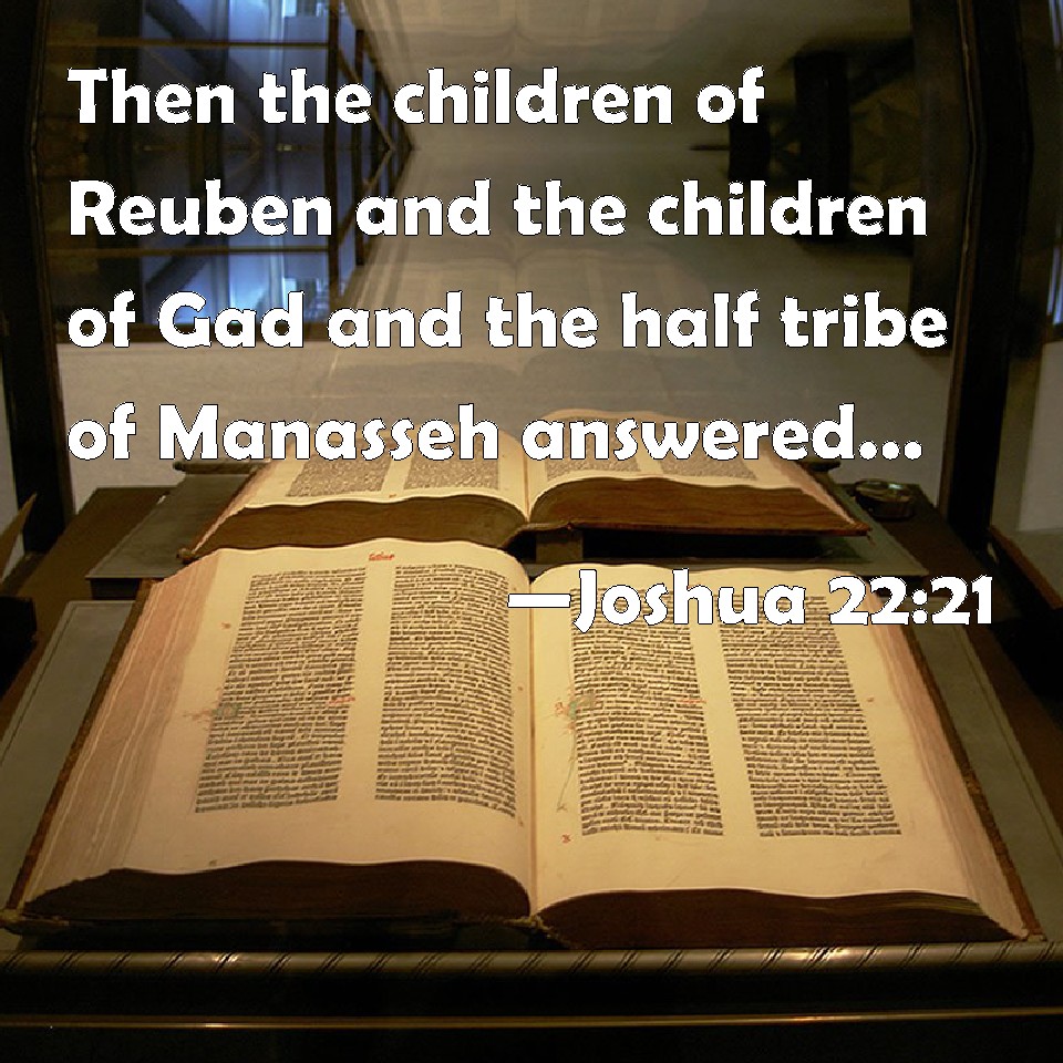 Choose a Background Joshua 22:21 Then the children of Reuben and the children of Gad and the half tribe of Manasseh answered, and said to the heads of the thousands of Israel, KJV: Then the children of Reuben and the children of Gad and the half tribe of Manasseh answered, and said unto the heads of the thousands of Israel, DRB: And the children of Ruben, and of Gad, and of the half tribe of Manasses answered the princes of the embassage of Israel: DBT: And the children of Reuben and the children of Gad and the half tribe of Manasseh answered and said to the heads of the thousands of Israel, ERV: Then the children of Reuben and the children of Gad and the half tribe of Manasseh answered, and spake unto the heads of the thousands of Israel, WBT: Then the children of Reuben, and the children of Gad, and the half-tribe of Manasseh answered, and said to the heads of the thousands of Israel, WEB: Then the children of Reuben and the children of Gad and the half-tribe of Manasseh answered, and spoke to the heads of the thousands of Israel, YLT: And the sons of Reuben, and the sons of Gad, and the half of the tribe of Manasseh, answer and speak with the heads of the thousands of Israel:Links Joshua 22:21 NIV • Joshua 22:21 NLT • Joshua 22:21 ESV • Joshua 22:21 NASB • Joshua 22:21 KJV • Joshua 22:21 Interlinear • Joshua 22:21 Commentaries • Joshua 22:21 Parallel Texts • Joshua 22:21 Bible Apps • Joshua 22:21 Parallel • Bible Hub |