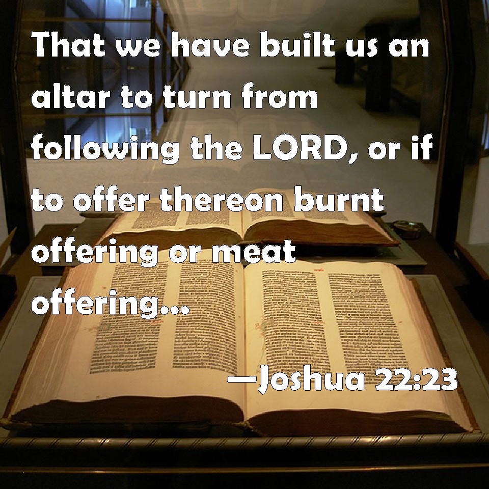 Choose a Background Joshua 22:23 That we have built us an altar to turn from following the LORD, or if to offer thereon burnt offering or meat offering, or if to offer peace offerings thereon, let the LORD himself require it; KJV: That we have built us an altar to turn from following the LORD, or if to offer thereon burnt offering or meat offering, or if to offer peace offerings thereon, let the LORD himself require it; DRB: And if we did it with that mind, that we might lay upon it holocausts, and sacrifice, and victims of peace offerings, let him require and judge: DBT: that we have built for ourselves an altar to turn from following Jehovah, and if it is to offer up burnt-offering and oblation on it, and if to offer peace-offerings thereon, let Jehovah himself require it from us; ERV: that we have built us an altar to turn away from following the LORD; or if to offer thereon burnt offering or meal offering, or if to offer sacrifices of peace offerings thereon, let the LORD himself require it; WBT: That we have built us an altar to turn from following the LORD, or if to offer on it burnt-offering, or meat-offering, or if to offer peace-offerings on it, let the LORD himself require it; WEB: that we have built us an altar to turn away from following Yahweh; or if to offer burnt offering or meal offering, or if to offer sacrifices of peace offerings, let Yahweh himself require it. YLT: we are building for ourselves an altar to turn back from after Jehovah, and if to cause to go up on it burnt-offering and present, and if to make on it peace-offerings — Jehovah Himself doth require it.Links Joshua 22:23 NIV • Joshua 22:23 NLT • Joshua 22:23 ESV • Joshua 22:23 NASB • Joshua 22:23 KJV • Joshua 22:23 Interlinear • Joshua 22:23 Commentaries • Joshua 22:23 Parallel Texts • Joshua 22:23 Bible Apps • Joshua 22:23 Parallel • Bible Hub |