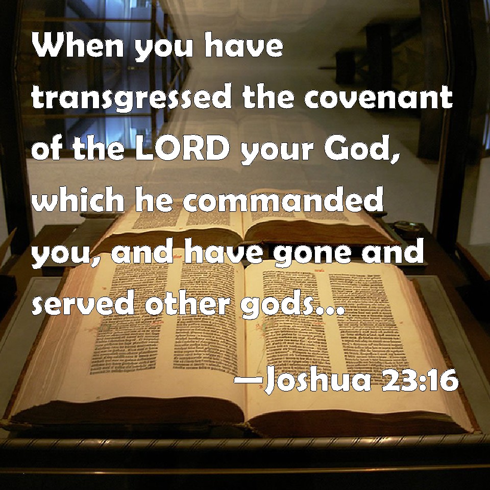 Choose a Background Joshua 23:16 When you have transgressed the covenant of the LORD your God, which he commanded you, and have gone and served other gods, and bowed yourselves to them; then shall the anger of the LORD be kindled against you, and you shall perish quickly from off the good land which he has given to you. KJV: When ye have transgressed the covenant of the LORD your God, which he commanded you, and have gone and served other gods, and bowed yourselves to them; then shall the anger of the LORD be kindled against you, and ye shall perish quickly from off the good land which he hath given unto you. DRB: When you shall have transgressed the covenant of the Lord your God, which he hath made with you, and shall have served strange gods, and adored them : then shall the indignation of the Lord rise up quickly and speedily against you, and you shall be taken away from this excellent land, which he hath delivered to you. DBT: when ye transgress the covenant of Jehovah your God which he commanded you, and go and serve other gods, and bow yourselves unto them, so that the anger of Jehovah shall be kindled against you, and ye shall perish quickly from off the good land which he hath given unto you. ERV: When ye transgress the covenant of the LORD your God, which he commanded you, and go and serve other gods, and bow down yourselves to them; then shall the anger of the LORD be kindled against you, and ye shall perish quickly from off the good land which he hath given unto you. WBT: When ye have transgressed the covenant of the LORD your God, which he commanded you, and have gone and served other gods, and bowed yourselves to them; then shall the anger of the LORD be kindled against you, and ye shall perish quickly from off the good land which he hath given to you. WEB: when you disobey the covenant of Yahweh your God, which he commanded you, and go and serve other gods, and bow down yourselves to them. Then the anger of Yahweh will be kindled against you, and you will perish quickly from off the good land which he has given to you." YLT: in your transgressing the covenant of Jehovah your God which He commanded you, and ye have gone and served other gods, and bowed yourselves to them, then hath the anger of Jehovah burned against you, and ye have perished hastily from off the good land which He hath given to you.'Links Joshua 23:16 NIV • Joshua 23:16 NLT • Joshua 23:16 ESV • Joshua 23:16 NASB • Joshua 23:16 KJV • Joshua 23:16 Interlinear • Joshua 23:16 Commentaries • Joshua 23:16 Parallel Texts • Joshua 23:16 Bible Apps • Joshua 23:16 Parallel • Bible Hub |