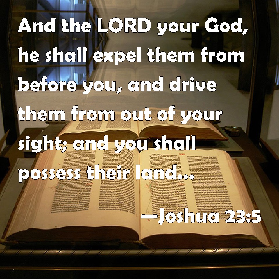 Choose a Background Joshua 23:5 And the LORD your God, he shall expel them from before you, and drive them from out of your sight; and you shall possess their land, as the LORD your God has promised to you. KJV: And the LORD your God, he shall expel them from before you, and drive them from out of your sight; and ye shall possess their land, as the LORD your God hath promised unto you. DRB: The Lord your God will destroy them, and take them away from before your face, and you shall possess the land as he hath promised you. DBT: And Jehovah your God, he will expel them from before you, and dispossess them from out of your sight; and ye shall take possession of their land, as Jehovah your God hath said unto you. ERV: And the LORD your God, he shall thrust them out from before you, and drive them from out of your sight; and ye shall possess their land, as the LORD your God spake unto you. WBT: And the LORD your God, he shall expel them from before you, and drive them from your sight; and ye shall possess their land, as the LORD your God hath promised to you. WEB: Yahweh your God will thrust them out from before you, and drive them from out of your sight. You shall possess their land, as Yahweh your God spoke to you. YLT: 'As to Jehovah your God, He doth thrust them from your presence, and hath dispossessed them from before you, and ye have possessed their land, as Jehovah your God hath spoken to you,Links Joshua 23:5 NIV • Joshua 23:5 NLT • Joshua 23:5 ESV • Joshua 23:5 NASB • Joshua 23:5 KJV • Joshua 23:5 Interlinear • Joshua 23:5 Commentaries • Joshua 23:5 Parallel Texts • Joshua 23:5 Bible Apps • Joshua 23:5 Parallel • Bible Hub |