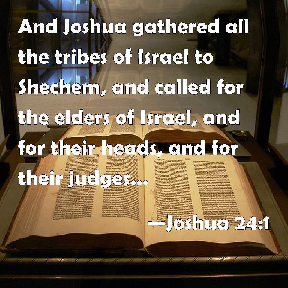 Choose a Background Joshua 24:1 And Joshua gathered all the tribes of Israel to Shechem, and called for the elders of Israel, and for their heads, and for their judges, and for their officers; and they presented themselves before God. KJV: And Joshua gathered all the tribes of Israel to Shechem, and called for the elders of Israel, and for their heads, and for their judges, and for their officers; and they presented themselves before God. DRB: And Josue gathered together all the tribes of Israel in Sichem, and called for the ancients, and the princes, and the judges, and the masters: and they stood in the sight of the Lord: DBT: And Joshua gathered all the tribes of Israel to Shechem, and called for the elders of Israel, and for their heads, and for their judges, and for their officers; and they presented themselves before God. ERV: And Joshua gathered all the tribes of Israel to Shechem, and called for the elders of Israel, and for their heads, and for their judges, and for their officers; and they presented themselves before God. WBT: And Joshua convened all the tribes of Israel to Shechem, and called for the elders of Israel, and for their heads, and for their judges, and for their officers; and they presented themselves before God. WEB: Joshua gathered all the tribes of Israel to Shechem, and called for the elders of Israel, for their heads, for their judges, and for their officers; and they presented themselves before God. YLT: And Joshua gathereth all the tribes of Israel to Shechem, and calleth for the elders of Israel, and for its heads, and for its judges, and for its authorities, and they station themselves before God.Links Joshua 24:1 NIV • Joshua 24:1 NLT • Joshua 24:1 ESV • Joshua 24:1 NASB • Joshua 24:1 KJV • Joshua 24:1 Interlinear • Joshua 24:1 Commentaries • Joshua 24:1 Parallel Texts • Joshua 24:1 Bible Apps • Joshua 24:1 Parallel • Bible Hub |