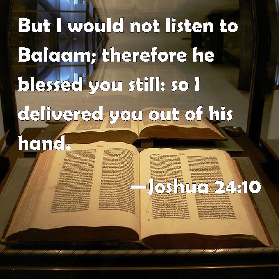 Joshua 24:10 But I would not listen to Balaam; therefore he blessed you still: so I delivered you out of his hand.