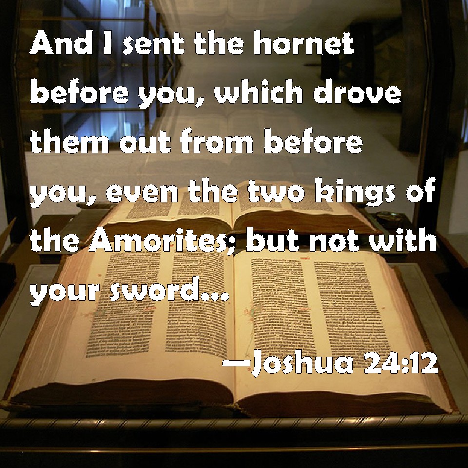 Choose a Background Joshua 24:12 And I sent the hornet before you, which drove them out from before you, even the two kings of the Amorites; but not with your sword, nor with your bow. KJV: And I sent the hornet before you, which drave them out from before you, even the two kings of the Amorites; but not with thy sword, nor with thy bow. DRB: And I sent before you hornets: and I drove them out from their places, the two kings of the Amorrhites, not with thy sword nor with thy bow. DBT: And I sent the hornet before you, which drove them out from before you, as the two kings of the Amorites; not with thy sword, nor with thy bow. ERV: And I sent the hornet before you, which drave them out from before you, even the two kings of the Amorites; not with thy sword, nor with thy bow. WBT: And I sent the hornet before you, which drove them out from before you, even the two kings of the Amorites; but not with thy sword, nor with thy bow. WEB: I sent the hornet before you, which drove them out from before you, even the two kings of the Amorites; not with your sword, nor with your bow. YLT: And I send before you the hornet, and it casteth them out from your presence — two kings of the Amorite — not by thy sword, nor by thy bow.Links Joshua 24:12 NIV • Joshua 24:12 NLT • Joshua 24:12 ESV • Joshua 24:12 NASB • Joshua 24:12 KJV • Joshua 24:12 Interlinear • Joshua 24:12 Commentaries • Joshua 24:12 Parallel Texts • Joshua 24:12 Bible Apps • Joshua 24:12 Parallel • Bible Hub |