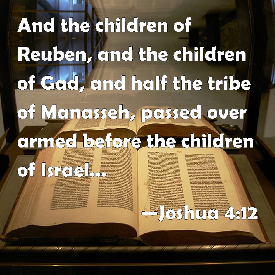 Choose a Background Joshua 4:12 And the children of Reuben, and the children of Gad, and half the tribe of Manasseh, passed over armed before the children of Israel, as Moses spoke to them: KJV: And the children of Reuben, and the children of Gad, and half the tribe of Manasseh, passed over armed before the children of Israel, as Moses spake unto them: DRB: The children of Ruben also and Gad, and half the tribe of Manasses, went armed before the children of Israel as Moses had commanded them. DBT: And the children of Reuben, and the children of Gad, and the half tribe of Manasseh, went over in array before the children of Israel, as Moses had spoken to them. ERV: And the children of Reuben, and the children of Gad, and the half tribe of Manasseh, passed over armed before the children of Israel, as Moses spake unto them: WBT: And the children of Reuben, and the children of Gad, and half the tribe of Manasseh, passed over armed before the children of Israel, as Moses directed them: WEB: The children of Reuben, and the children of Gad, and the half-tribe of Manasseh, passed over armed before the children of Israel, as Moses spoke to them. YLT: and the sons of Reuben, and the sons of Gad, and the half of the tribe of Manasseh, pass over, by fifties, before the sons of Israel, as Moses had spoken unto them;Links Joshua 4:12 NIV • Joshua 4:12 NLT • Joshua 4:12 ESV • Joshua 4:12 NASB • Joshua 4:12 KJV • Joshua 4:12 Interlinear • Joshua 4:12 Commentaries • Joshua 4:12 Parallel Texts • Joshua 4:12 Bible Apps • Joshua 4:12 Parallel • Bible Hub |