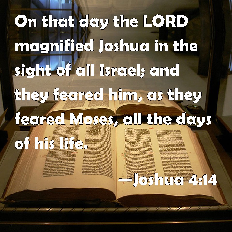 Choose a Background Joshua 4:14 On that day the LORD magnified Joshua in the sight of all Israel; and they feared him, as they feared Moses, all the days of his life. KJV: On that day the LORD magnified Joshua in the sight of all Israel; and they feared him, as they feared Moses, all the days of his life. DRB: In that day the Lord magnified Josue in the sight of all Israel, that they should fear him, as they had feared Moses, while he lived. DBT: On that day Jehovah magnified Joshua in the sight of all Israel; and they feared him, as they had feared Moses, all the days of his life. ERV: On that day the LORD magnified Joshua in the sight of all Israel; and they feared him, as they feared Moses, all the days of his life. WBT: On that day the LORD magnified Joshua in the sight of all Israel, and they feared him, as they feared Moses, all the days of his life. WEB: On that day, Yahweh magnified Joshua in the sight of all Israel; and they feared him, as they feared Moses, all the days of his life. YLT: On that day hath Jehovah made Joshua great in the eyes of all Israel, and they reverence him, as they reverenced Moses, all days of his life.Links Joshua 4:14 NIV • Joshua 4:14 NLT • Joshua 4:14 ESV • Joshua 4:14 NASB • Joshua 4:14 KJV • Joshua 4:14 Interlinear • Joshua 4:14 Commentaries • Joshua 4:14 Parallel Texts • Joshua 4:14 Bible Apps • Joshua 4:14 Parallel • Bible Hub |