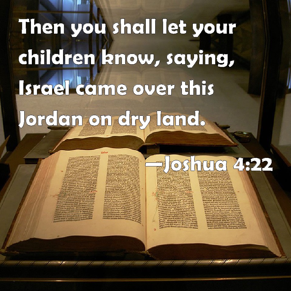 Choose a Background Joshua 4:22 Then you shall let your children know, saying, Israel came over this Jordan on dry land. KJV: Then ye shall let your children know, saying, Israel came over this Jordan on dry land. DRB: You shall teach them and say: Israel passed over this Jordan through the dry channel. DBT: then ye shall let your children know, saying, On dry land did Israel come over this Jordan; ERV: Then ye shall let your children know, saying, Israel came over this Jordan on dry land. WBT: Then ye shall let your children know, saying, Israel came over this Jordan on dry land. WEB: Then you shall let your children know, saying, 'Israel came over this Jordan on dry land. YLT: then ye have caused your sons to know, saying, On dry land Israel passed over this Jordan;Links Joshua 4:22 NIV • Joshua 4:22 NLT • Joshua 4:22 ESV • Joshua 4:22 NASB • Joshua 4:22 KJV • Joshua 4:22 Interlinear • Joshua 4:22 Commentaries • Joshua 4:22 Parallel Texts • Joshua 4:22 Bible Apps • Joshua 4:22 Parallel • Bible Hub |