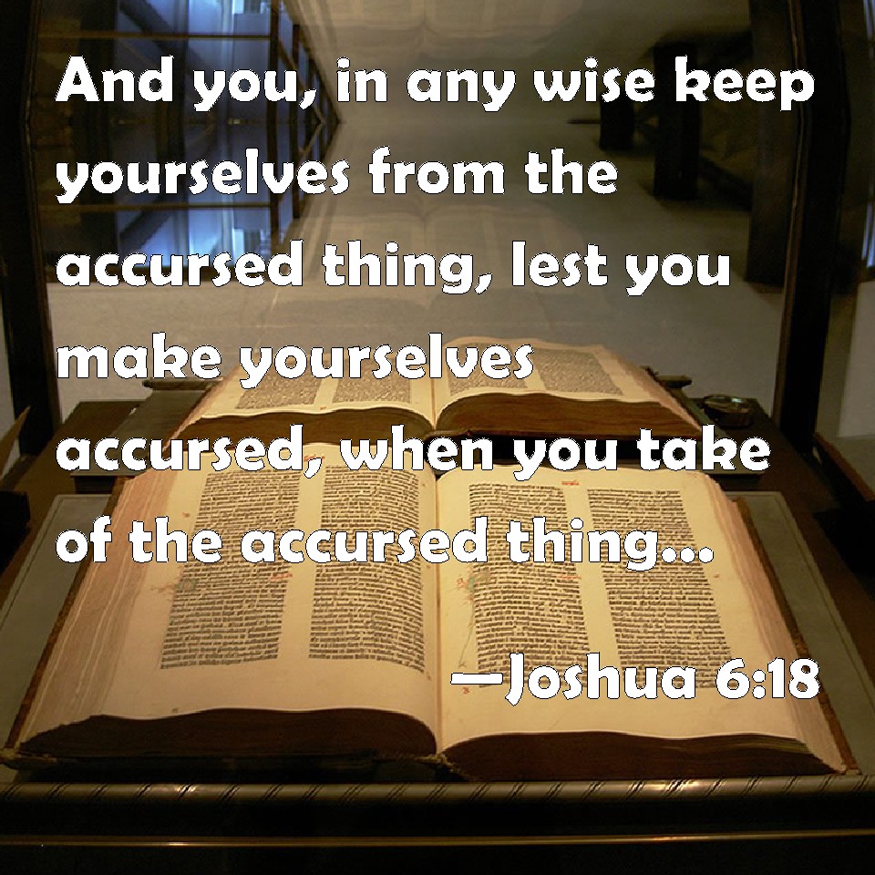 Choose a Background Joshua 6:18 And you, in any wise keep yourselves from the accursed thing, lest you make yourselves accursed, when you take of the accursed thing, and make the camp of Israel a curse, and trouble it. KJV: And ye, in any wise keep yourselves from the accursed thing, lest ye make yourselves accursed, when ye take of the accursed thing, and make the camp of Israel a curse, and trouble it. DRB: But beware ye lest you touch ought of those things that are forbidden, and you be guilty of transgression, and all the camp of Israel be under sin, and be troubled. DBT: But in any wise keep from the accursed thing, lest ye make yourselves accursed in taking of the accursed thing, and make the camp of Israel a curse, and trouble it. ERV: And ye, in any wise keep yourselves from the devoted thing, lest when ye have devoted it, ye take of the devoted thing; so should ye make the camp of Israel accursed, and trouble it. WBT: And ye, in any wise keep yourselves from the accursed thing, lest ye make yourselves accursed, when ye take of the accursed thing, and make the camp of Israel a curse, and trouble it. WEB: But as for you, only keep yourselves from the devoted thing, lest when you have devoted it, you take of the devoted thing; so would you make the camp of Israel accursed, and trouble it. YLT: and surely ye have kept from the devoted thing, lest ye devote yourselves, and have taken from the devoted thing, and have made the camp of Israel become a devoted thing, and have troubled it;Links Joshua 6:18 NIV • Joshua 6:18 NLT • Joshua 6:18 ESV • Joshua 6:18 NASB • Joshua 6:18 KJV • Joshua 6:18 Interlinear • Joshua 6:18 Commentaries • Joshua 6:18 Parallel Texts • Joshua 6:18 Bible Apps • Joshua 6:18 Parallel • Bible Hub |