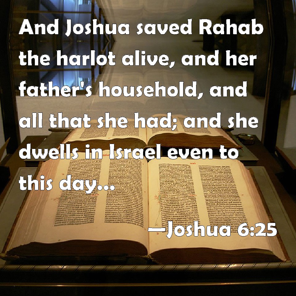 Choose a Background Joshua 6:25 And Joshua saved Rahab the harlot alive, and her father's household, and all that she had; and she dwells in Israel even to this day; because she hid the messengers, which Joshua sent to spy out Jericho. KJV: And Joshua saved Rahab the harlot alive, and her father's household, and all that she had; and she dwelleth in Israel even unto this day; because she hid the messengers, which Joshua sent to spy out Jericho. DRB: But Josue saved Rahab the harlot and her father's house, and all she had, and they dwelt in the midst of Israel until this present day: because she hid the messengers whom he had sent to spy out Jericho. At that time, Josue made an imprecation, saying: DBT: And Joshua saved alive Rahab the harlot, and her father's household, and all that she had, and she dwelt in the midst of Israel to this day; because she hid the messengers whom Joshua had sent to spy out Jericho. ERV: But Rahab the harlot, and her father's household, and all that she had, did Joshua save alive; and she dwelt in the midst of Israel, unto this day; because she hid the messengers, which Joshua sent to spy out Jericho. WBT: And Joshua saved Rahab the harlot alive, and her father's household, and all that she had; and she dwelleth in Israel even to this day; because she hid the messengers which Joshua sent to spy out Jericho. WEB: But Rahab the prostitute, her father's household, and all that she had, Joshua saved alive. She lived in the midst of Israel to this day, because she hid the messengers, whom Joshua sent to spy out Jericho. YLT: and Rahab the harlot, and the house of her father, and all whom she hath, hath Joshua kept alive; and she dwelleth in the midst of Israel unto this day, for she hid the messengers whom Joshua sent to spy out Jericho.Links Joshua 6:25 NIV • Joshua 6:25 NLT • Joshua 6:25 ESV • Joshua 6:25 NASB • Joshua 6:25 KJV • Joshua 6:25 Interlinear • Joshua 6:25 Commentaries • Joshua 6:25 Parallel Texts • Joshua 6:25 Bible Apps • Joshua 6:25 Parallel • Bible Hub |