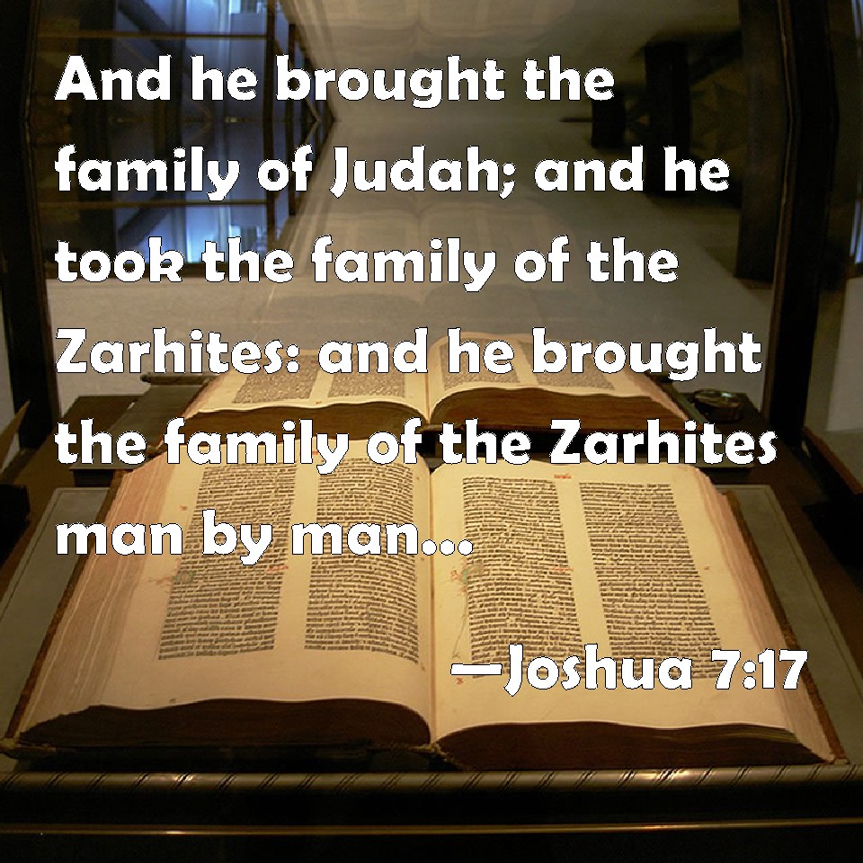 Joshua 7:17 And he brought the family of Judah; and he took the family of the Zarhites: and he brought the family of the Zarhites man by man; and Zabdi was taken: