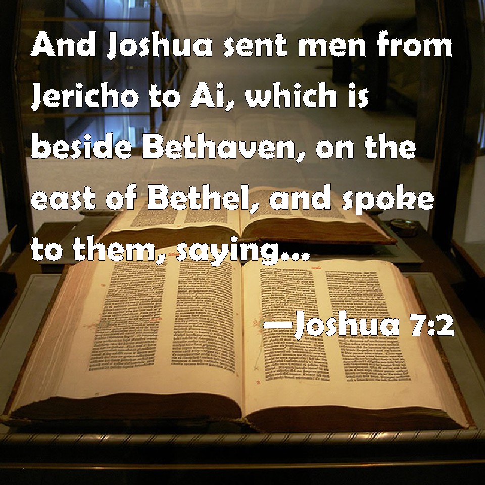 Choose a Background Joshua 7:2 And Joshua sent men from Jericho to Ai, which is beside Bethaven, on the east of Bethel, and spoke to them, saying, Go up and view the country. And the men went up and viewed Ai. KJV: And Joshua sent men from Jericho to Ai, which is beside Bethaven, on the east side of Bethel, and spake unto them, saying, Go up and view the country. And the men went up and viewed Ai. DRB: And when Josue sent men from Jericho against Hai, which is beside Bethaven, on the east side of the town of Bethel, he said to them: Go up, and view the country: and they fulfilled his command, and viewed Hai. DBT: And Joshua sent men from Jericho to Ai, which is beside Beth-Aven, on the east side of Bethel, and spoke to them, saying, Go up and spy out the country. And the men went up and spied out Ai. ERV: And Joshua sent men from Jericho to Ai, which is beside Beth-aven, on the east side of Beth-el, and spake unto them, saying, Go up and spy out the land. And the men went up and spied out Ai. WBT: And Joshua sent men from Jericho to Ai, which is beside Beth-aven, on the east side of Beth-el, and spoke to them, saying, Go up and view the country. And the men went up and viewed Ai. WEB: Joshua sent men from Jericho to Ai, which is beside Beth Aven, on the east side of Bethel, and spoke to them, saying, "Go up and spy out the land." The men went up and spied out Ai. YLT: And Joshua sendeth men from Jericho to Ai, which is near Beth-Aven, on the east of Bethel, and speaketh unto them, saying, 'Go up and spy the land;' and the men go up and spy Ai,Links Joshua 7:2 NIV • Joshua 7:2 NLT • Joshua 7:2 ESV • Joshua 7:2 NASB • Joshua 7:2 KJV • Joshua 7:2 Interlinear • Joshua 7:2 Commentaries • Joshua 7:2 Parallel Texts • Joshua 7:2 Bible Apps • Joshua 7:2 Parallel • Bible Hub |