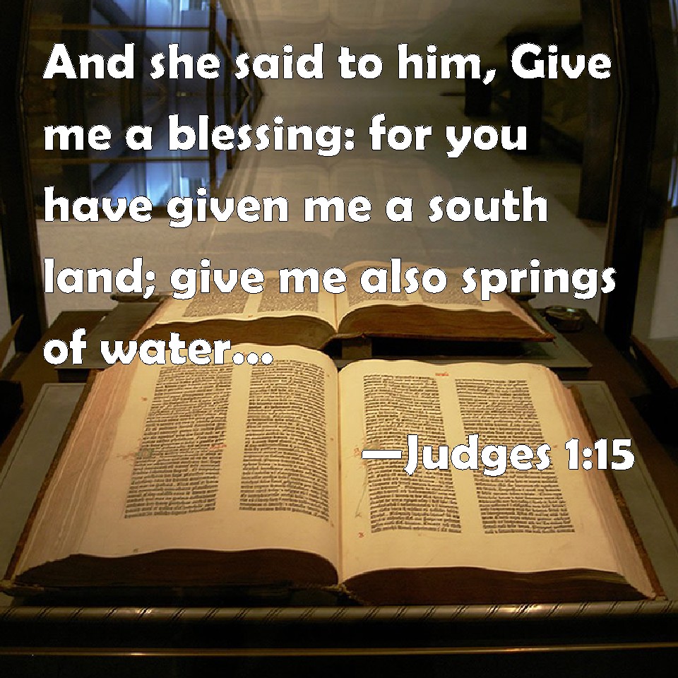 Choose a Background Judges 1:15 And she said to him, Give me a blessing: for you have given me a south land; give me also springs of water. And Caleb gave her the upper springs and the nether springs. KJV: And she said unto him, Give me a blessing: for thou hast given me a south land; give me also springs of water. And Caleb gave her the upper springs and the nether springs. DRB: But she answered: Give me a blessing, for thou hast given me a dry land: give me also a watery land. So Caleb gave her the upper and the nether watery ground. DBT: She said to him, "Give me a present; since you have set me in the land of the Negeb, give me also springs of water." And Caleb gave her the upper springs and the lower springs. ERV: And she said unto him, Give me a blessing; for that thou hast set me in the land of the South, give me also springs of water. And Caleb gave her the upper springs and the nether springs. WBT: And she said to him, Give me a blessing: for thou hast given me a south land; give me also springs of water. And Caleb gave her the upper springs, and the nether springs. WEB: She said to him, "Give me a blessing; for that you have set me in the land of the South, give me also springs of water." Then Caleb gave her the upper springs and the lower springs. YLT: And she saith to him, 'Give to me a blessing; when the south land thou hast given me — then thou hast given to me springs of water; and Caleb giveth to her the upper springs and the lower springs.Links Judges 1:15 NIV • Judges 1:15 NLT • Judges 1:15 ESV • Judges 1:15 NASB • Judges 1:15 KJV • Judges 1:15 Interlinear • Judges 1:15 Commentaries • Judges 1:15 Parallel Texts • Judges 1:15 Bible Apps • Judges 1:15 Parallel • Bible Hub |