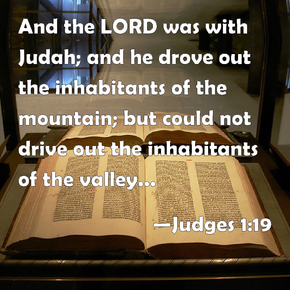 Choose a Background Judges 1:19 And the LORD was with Judah; and he drove out the inhabitants of the mountain; but could not drive out the inhabitants of the valley, because they had chariots of iron. KJV: And the LORD was with Judah; and he drave out the inhabitants of the mountain; but could not drive out the inhabitants of the valley, because they had chariots of iron. DRB: And the Lord was with Juda, and he possessed the hill country: but was not able to destroy the inhabitants of the valley, because they had many chariots armed with scythes. DBT: And the LORD was with Judah, and he took possession of the hill country, but he could not drive out the inhabitants of the plain, because they had chariots of iron. ERV: And the LORD was with Judah; and he drave out the inhabitants of the hill country; for he could not drive out the inhabitants of the valley, because they had chariots of iron. WBT: And the LORD was with Judah; and he drove out the inhabitants of the mountain; but could not drive out the inhabitants of the valley, because they had chariots of iron. WEB: Yahweh was with Judah; and drove out [the inhabitants of] the hill country; for he could not drive out the inhabitants of the valley, because they had chariots of iron. YLT: and Jehovah is with Judah, and he occupieth the hill-country, but not to dispossess the inhabitants of the valley, for they have chariots of iron.Links Judges 1:19 NIV • Judges 1:19 NLT • Judges 1:19 ESV • Judges 1:19 NASB • Judges 1:19 KJV • Judges 1:19 Interlinear • Judges 1:19 Commentaries • Judges 1:19 Parallel Texts • Judges 1:19 Bible Apps • Judges 1:19 Parallel • Bible Hub |