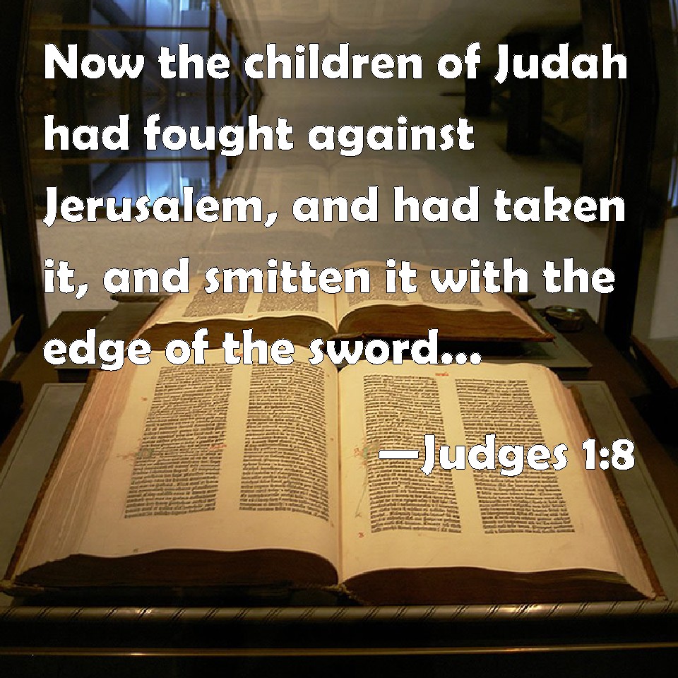 Choose a Background Judges 1:8 Now the children of Judah had fought against Jerusalem, and had taken it, and smitten it with the edge of the sword, and set the city on fire. KJV: Now the children of Judah had fought against Jerusalem, and had taken it, and smitten it with the edge of the sword, and set the city on fire. DRB: And the children of Juda besieging Jerusalem, took it, and put it to the sword, and set the whole city on fire. DBT: And the men of Judah fought against Jerusalem, and took it, and smote it with the edge of the sword, and set the city on fire. ERV: And the children of Judah fought against Jerusalem, and took it, and smote it with the edge of the sword, and set the city on fire. WBT: (Now the children of Judah had fought against Jerusalem, and had taken it, and smitten it with the edge of the sword, and set the city on fire.) WEB: The children of Judah fought against Jerusalem, and took it, and struck it with the edge of the sword, and set the city on fire. YLT: And the sons of Judah fight against Jerusalem, and capture it, and smite it by the mouth of the sword, and the city they have sent into fire;Links Judges 1:8 NIV • Judges 1:8 NLT • Judges 1:8 ESV • Judges 1:8 NASB • Judges 1:8 KJV • Judges 1:8 Interlinear • Judges 1:8 Commentaries • Judges 1:8 Parallel Texts • Judges 1:8 Bible Apps • Judges 1:8 Parallel • Bible Hub |