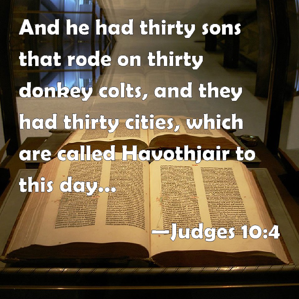 Choose a Background Judges 10:4 And he had thirty sons that rode on thirty ass colts, and they had thirty cities, which are called Havothjair to this day, which are in the land of Gilead. KJV: And he had thirty sons that rode on thirty ass colts, and they had thirty cities, which are called Havothjair unto this day, which are in the land of Gilead. DRB: Having thirty sons that rode on thirty ass colts, and were princes of thirty cities, which from his name were called Havoth Jair, that is, the towns of Jair, until this present day in the land of Galaad. DBT: And he had thirty sons who rode on thirty asses; and they had thirty cities, called Hav'voth-ja'ir to this day, which are in the land of Gilead. ERV: And he had thirty sons that rode on thirty ass colts, and they had thirty cities, which are called Havvoth-jair unto this day, which are in the land of Gilead. WBT: And he had thirty sons that rode on thirty ass colts, and they had thirty cities, which are called Havoth-jair to this day, which are in the land of Gilead. WEB: He had thirty sons who rode on thirty donkey colts, and they had thirty cities, which are called Havvoth Jair to this day, which are in the land of Gilead. YLT: and he hath thirty sons riding on thirty ass-colts, and they have thirty cities, (they call them Havoth-Jair unto this day), which are in the land of Gilead;Links Judges 10:4 NIV • Judges 10:4 NLT • Judges 10:4 ESV • Judges 10:4 NASB • Judges 10:4 KJV • Judges 10:4 Interlinear • Judges 10:4 Commentaries • Judges 10:4 Parallel Texts • Judges 10:4 Bible Apps • Judges 10:4 Parallel • Bible Hub |