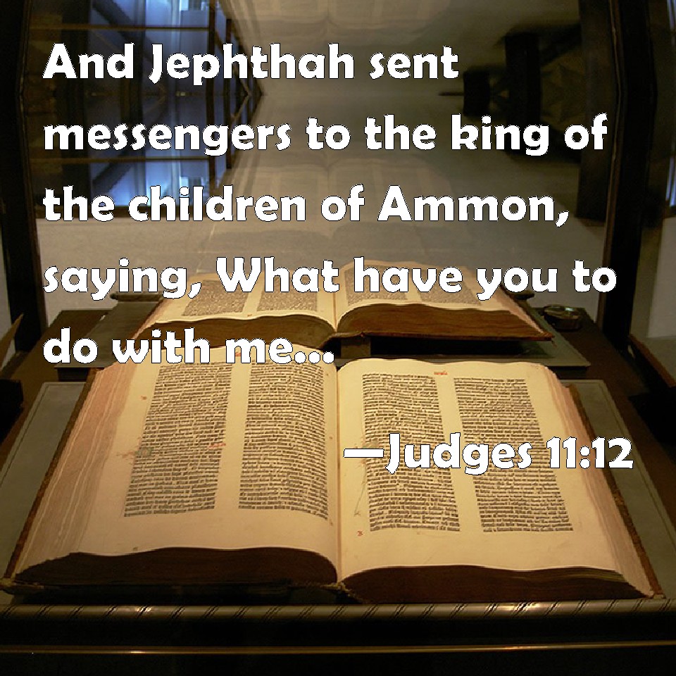Choose a Background Judges 11:12 And Jephthah sent messengers to the king of the children of Ammon, saying, What have you to do with me, that you are come against me to fight in my land? KJV: And Jephthah sent messengers unto the king of the children of Ammon, saying, What hast thou to do with me, that thou art come against me to fight in my land? DRB: And he sent messengers to the king of the children of Ammon, to say in his name, What hast thou to do with me, that thou art come against me, to waste my land? DBT: Then Jephthah sent messengers to the king of the Ammonites and said, "What have you against me, that you have come to me to fight against my land?" ERV: And Jephthah sent messengers unto the king of the children of Ammon, saying, What hast thou to do with me, that thou art come unto me to fight against my land? WBT: And Jephthah sent messengers to the king of the children of Ammon, saying, What hast thou to do with me, that thou hast come against me to fight in my land? WEB: Jephthah sent messengers to the king of the children of Ammon, saying, "What have you to do with me, that you have come to me to fight against my land?" YLT: And Jephthah sendeth messengers unto the king of the Bene-Ammon, saying, 'What — to me and to thee, that thou hast come in unto me, to fight in my land.'Links Judges 11:12 NIV • Judges 11:12 NLT • Judges 11:12 ESV • Judges 11:12 NASB • Judges 11:12 KJV • Judges 11:12 Interlinear • Judges 11:12 Commentaries • Judges 11:12 Parallel Texts • Judges 11:12 Bible Apps • Judges 11:12 Parallel • Bible Hub |