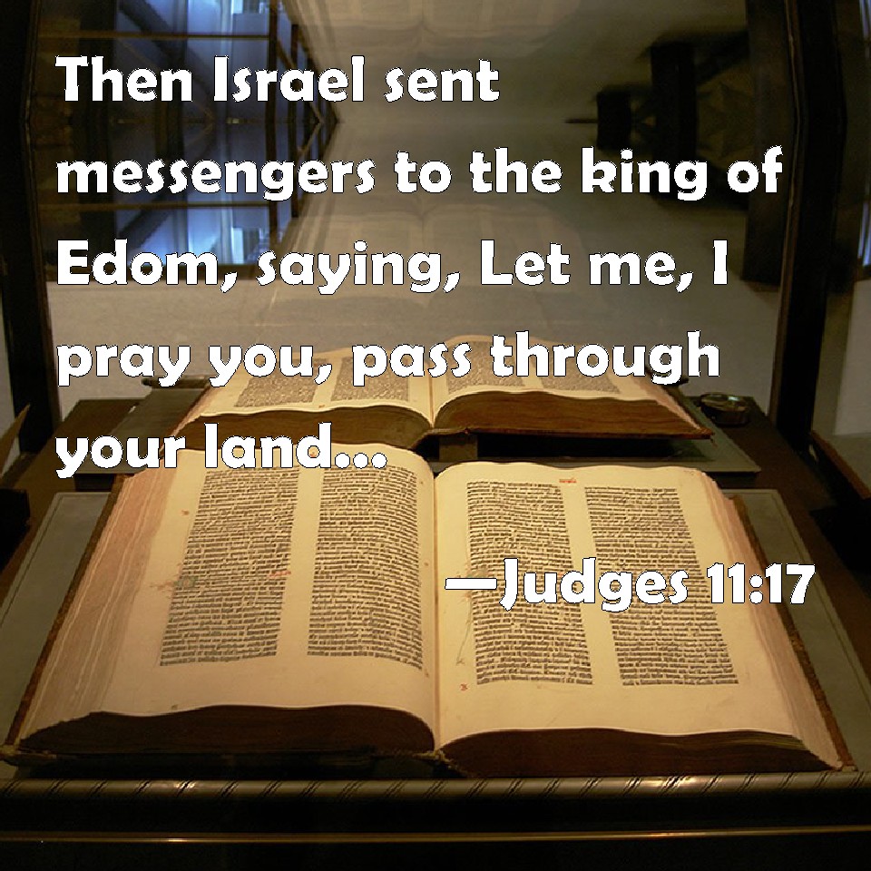 Choose a Background Judges 11:17 Then Israel sent messengers to the king of Edom, saying, Let me, I pray you, pass through your land: but the king of Edom would not listen thereto. And in like manner they sent to the king of Moab: but he would not consent: and Israel stayed in Kadesh. KJV: Then Israel sent messengers unto the king of Edom, saying, Let me, I pray thee, pass through thy land: but the king of Edom would not hearken thereto. And in like manner they sent unto the king of Moab: but he would not consent: and Israel abode in Kadesh. DRB: And he sent messengers to the king of Edom, saying: Suffer me to pass through thy land. But he would not condescend to his request. He sent also to the king of Moab, who likewise refused to give him passage. He abode therefore in Cades, DBT: Israel then sent messengers to the king of Edom, saying, 'Let us pass, we pray, through your land'; but the king of Edom would not listen. And they sent also to the king of Moab, but he would not consent. So Israel remained at Kadesh. ERV: then Israel sent messengers unto the king of Edom, saying, Let me, I pray thee, pass through thy land: but the king of Edom hearkened not. And in like manner he sent unto the king of Moab: but he would not: and Israel abode in Kadesh. WBT: Then Israel sent messengers to the king of Edom, saying, Let me, I pray thee, pass through thy land: but the king of Edom would not hearken to it. And in like manner they sent to the king of Moab; but he would not consent. And Israel abode in Kadesh. WEB: then Israel sent messengers to the king of Edom, saying, 'Please let me pass through your land;' but the king of Edom didn't listen. In the same way, he sent to the king of Moab; but he would not: and Israel stayed in Kadesh. YLT: and Israel sendeth messengers unto the king of Edom, saying, Let me pass over, I pray thee, through thy land, and the king of Edom hearkened not; and also unto the king of Moab hath Israel sent, and he hath not been willing; and Israel abideth in Kadesh,Links Judges 11:17 NIV • Judges 11:17 NLT • Judges 11:17 ESV • Judges 11:17 NASB • Judges 11:17 KJV • Judges 11:17 Interlinear • Judges 11:17 Commentaries • Judges 11:17 Parallel Texts • Judges 11:17 Bible Apps • Judges 11:17 Parallel • Bible Hub |