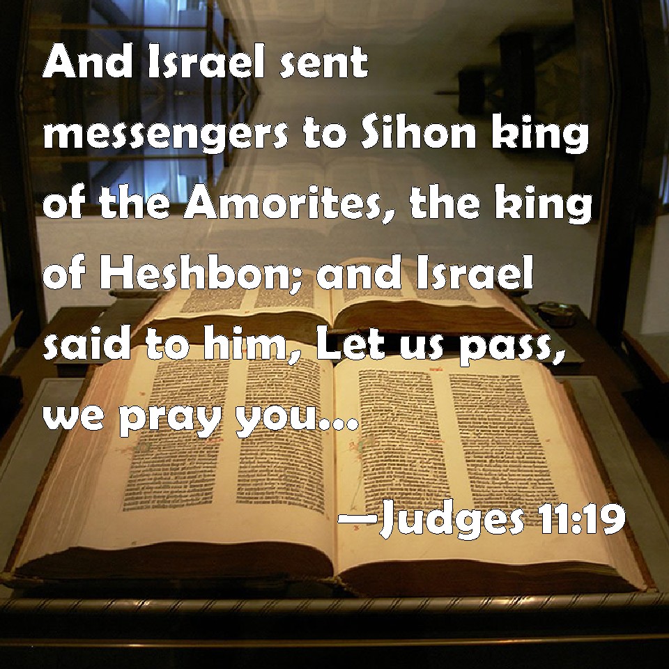 Choose a Background Judges 11:19 And Israel sent messengers to Sihon king of the Amorites, the king of Heshbon; and Israel said to him, Let us pass, we pray you, through your land into my place. KJV: And Israel sent messengers unto Sihon king of the Amorites, the king of Heshbon; and Israel said unto him, Let us pass, we pray thee, through thy land into my place. DRB: So Israel sent messengers to Sehon king of the Amorrhites, who dwelt in Hesebon, and they said to him: Suffer me to pass through thy land to the river. DBT: Israel then sent messengers to Sihon king of the Amorites, king of Heshbon; and Israel said to him, 'Let us pass, we pray, through your land to our country.' ERV: And Israel sent messengers unto Sihon king of the Amorites, the king of Heshbon; and Israel said unto him, Let us pass, we pray thee, through thy land unto my place. WBT: And Israel sent messengers to Sihon king of the Amorites, the king of Heshbon; and Israel said to him, Let us pass, we pray thee, through thy land to my place. WEB: Israel sent messengers to Sihon king of the Amorites, the king of Heshbon; and Israel said to him, 'Please let us pass through your land to my place.' YLT: 'And Israel sendeth messengers unto Sihon, king of the Amorite, king of Heshbon, and Israel saith to him, Let us pass over, we pray thee, through thy land, unto my place,Links Judges 11:19 NIV • Judges 11:19 NLT • Judges 11:19 ESV • Judges 11:19 NASB • Judges 11:19 KJV • Judges 11:19 Interlinear • Judges 11:19 Commentaries • Judges 11:19 Parallel Texts • Judges 11:19 Bible Apps • Judges 11:19 Parallel • Bible Hub |