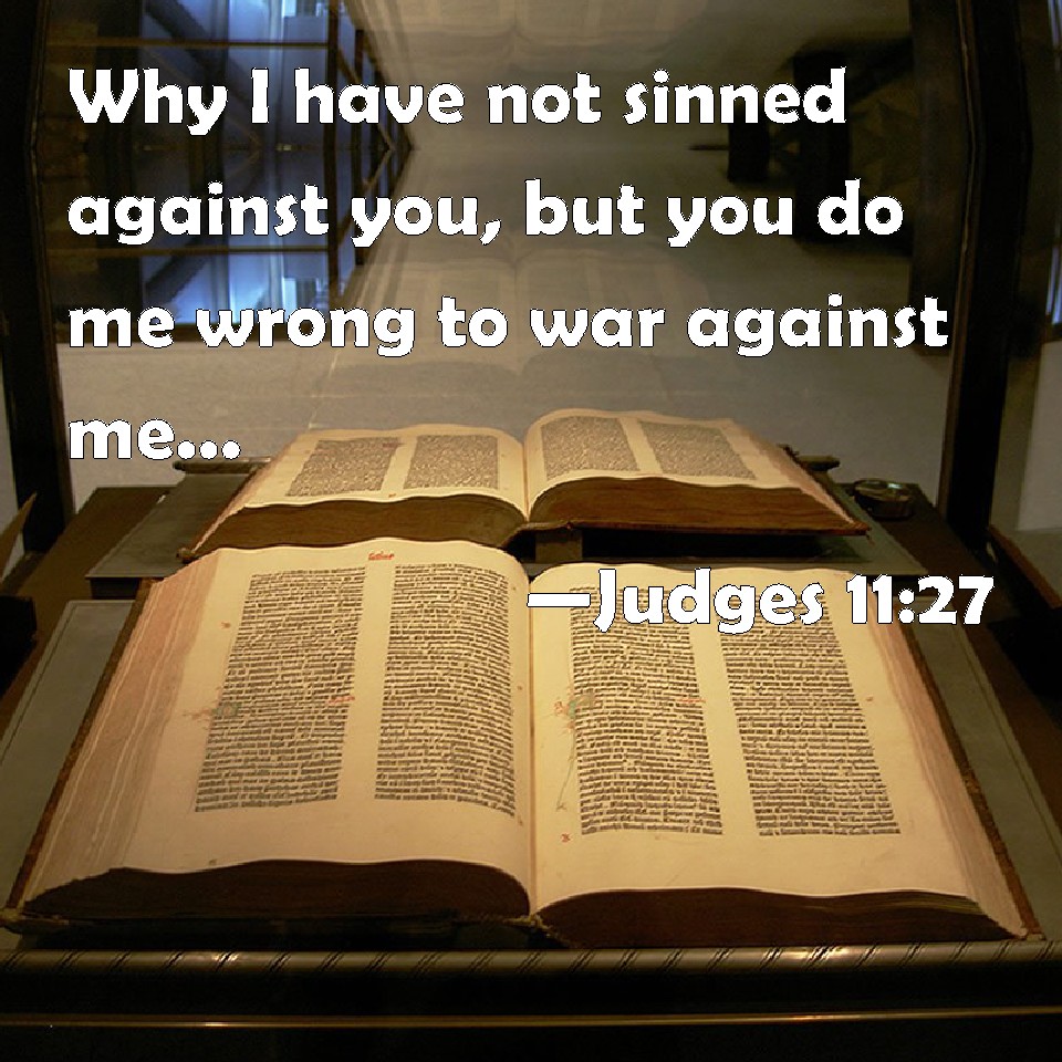 Choose a Background Judges 11:27 Why I have not sinned against you, but you do me wrong to war against me: the LORD the Judge be judge this day between the children of Israel and the children of Ammon. KJV: Wherefore I have not sinned against thee, but thou doest me wrong to war against me: the LORD the Judge be judge this day between the children of Israel and the children of Ammon. DRB: Therefore I do not trespass against thee, but thou wrongest me by declaring an unjust war against me. The Lord be judge and decide this day between Israel and the children of Ammon. DBT: I therefore have not sinned against you, and you do me wrong by making war on me; the LORD, the Judge, decide this day between the people of Israel and the people of Ammon." ERV: I therefore have not sinned against thee, but thou doest me wrong to war against me: the LORD, the Judge, be judge this day between the children of Israel and the children of Ammon. WBT: Wherefore I have not sinned against thee, but thou doest me wrong to war against me: the LORD the Judge be judge this day between the children of Israel and the children of Ammon. WEB: I therefore have not sinned against you, but you do me wrong to war against me. Yahweh, the Judge, be judge this day between the children of Israel and the children of Ammon." YLT: And I — I have not sinned against thee, and thou art doing with me evil — to fight against me. Jehovah, the Judge, doth judge to-day between the sons of Israel and the sons of Ammon.'Links Judges 11:27 NIV • Judges 11:27 NLT • Judges 11:27 ESV • Judges 11:27 NASB • Judges 11:27 KJV • Judges 11:27 Interlinear • Judges 11:27 Commentaries • Judges 11:27 Parallel Texts • Judges 11:27 Bible Apps • Judges 11:27 Parallel • Bible Hub |