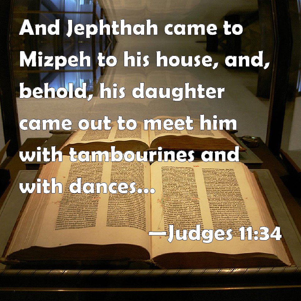 Choose a Background Judges 11:34 And Jephthah came to Mizpeh to his house, and, behold, his daughter came out to meet him with tambourines and with dances: and she was his only child; beside her he had neither son nor daughter. KJV: And Jephthah came to Mizpeh unto his house, and, behold, his daughter came out to meet him with timbrels and with dances: and she was his only child; beside her he had neither son nor daughter. DRB: And when Jephte returned into Maspha to his house, his only daughter met him with timbrels and with dances: for he had no other children. DBT: Then Jephthah came to his home at Mizpah; and behold, his daughter came out to meet him with timbrels and with dances; she was his only child; beside her he had neither son nor daughter. ERV: And Jephthah came to Mizpah unto his house, and, behold, his daughter came out to meet him with timbrels and with dances: and she was his only child; beside her he had neither son nor daughter. WBT: And Jephthah came to Mizpeh to his house, and behold, his daughter came out to meet him with timbrels and with dances: and she was his only child; beside her he had neither son nor daughter. WEB: Jephthah came to Mizpah to his house; and behold, his daughter came out to meet him with tambourines and with dances: and she was his only child; besides her he had neither son nor daughter. YLT: And Jephthah cometh into Mizpeh, unto his house, and lo, his daughter is coming out to meet him with timbrels, and with choruses, and save her alone, he hath none, son or daughter.Links Judges 11:34 NIV • Judges 11:34 NLT • Judges 11:34 ESV • Judges 11:34 NASB • Judges 11:34 KJV • Judges 11:34 Interlinear • Judges 11:34 Commentaries • Judges 11:34 Parallel Texts • Judges 11:34 Bible Apps • Judges 11:34 Parallel • Bible Hub |