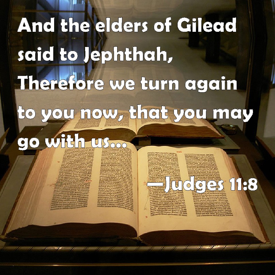 Choose a Background Judges 11:8 And the elders of Gilead said to Jephthah, Therefore we turn again to you now, that you may go with us, and fight against the children of Ammon, and be our head over all the inhabitants of Gilead. KJV: And the elders of Gilead said unto Jephthah, Therefore we turn again to thee now, that thou mayest go with us, and fight against the children of Ammon, and be our head over all the inhabitants of Gilead. DRB: And the princes of Galaad said to Jephte: For this cause we are now come to thee, that thou mayst go with us, and fight against the children of Ammon, and be head over all the inhabitants of Galaad. DBT: And the elders of Gilead said to Jephthah, "That is why we have turned to you now, that you may go with us and fight with the Ammonites, and be our head over all the inhabitants of Gilead." ERV: And the elders of Gilead said unto Jephthah, Therefore are we turned again to thee now, that thou mayest go with us, and fight with the children of Ammon, and thou shalt be our head over all the inhabitants of Gilead. WBT: And the elders of Gilead said to Jephthah, Therefore we turn again to thee now, that thou mayest go with us, and fight against the children of Ammon, and be our head over all the inhabitants of Gilead. WEB: The elders of Gilead said to Jephthah, "Therefore we have turned again to you now, that you may go with us, and fight with the children of Ammon; and you shall be our head over all the inhabitants of Gilead." YLT: and the elders of Gilead say unto Jephthah, 'Therefore, now, we have turned back unto thee; and thou hast gone with us, and fought against the Bene-Ammon, and thou hast been to us for head — to all the inhabitants of Gilead.'Links Judges 11:8 NIV • Judges 11:8 NLT • Judges 11:8 ESV • Judges 11:8 NASB • Judges 11:8 KJV • Judges 11:8 Interlinear • Judges 11:8 Commentaries • Judges 11:8 Parallel Texts • Judges 11:8 Bible Apps • Judges 11:8 Parallel • Bible Hub |