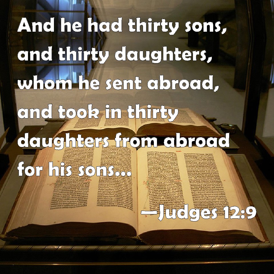 Choose a Background Judges 12:9 And he had thirty sons, and thirty daughters, whom he sent abroad, and took in thirty daughters from abroad for his sons. And he judged Israel seven years. KJV: And he had thirty sons, and thirty daughters, whom he sent abroad, and took in thirty daughters from abroad for his sons. And he judged Israel seven years. DRB: He had thirty sons, and as many daughters, whom he sent abroad, and gave to husbands, and took wives for his sons of the same number, bringing them into his house. And he judged Israel seven years: DBT: He had thirty sons; and thirty daughters he gave in marriage outside his clan, and thirty daughters he brought in from outside for his sons. And he judged Israel seven years. ERV: And he had thirty sons, and thirty daughters he sent abroad, and thirty daughters he brought in from abroad for his sons. And he judged Israel seven years. WBT: And he had thirty sons and thirty daughters whom he sent abroad, and took in thirty daughters from abroad for his sons: and he judged Israel seven years. WEB: He had thirty sons; and thirty daughters he sent abroad, and thirty daughters he brought in from abroad for his sons. He judged Israel seven years. YLT: and he hath thirty sons and thirty daughters, he hath sent without and thirty daughters hath brought in to his sons from without; and he judgeth Israel seven years.Links Judges 12:9 NIV • Judges 12:9 NLT • Judges 12:9 ESV • Judges 12:9 NASB • Judges 12:9 KJV • Judges 12:9 Interlinear • Judges 12:9 Commentaries • Judges 12:9 Parallel Texts • Judges 12:9 Bible Apps • Judges 12:9 Parallel • Bible Hub |
