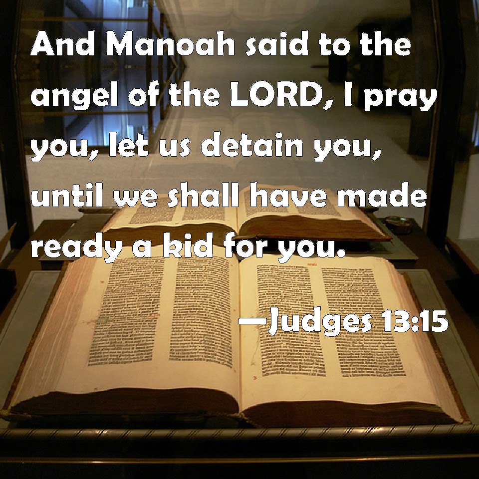 Choose a Background Judges 13:15 And Manoah said to the angel of the LORD, I pray you, let us detain you, until we shall have made ready a kid for you. KJV: And Manoah said unto the angel of the LORD, I pray thee, let us detain thee, until we shall have made ready a kid for thee. DRB: And Manue said to the angel of the Lord: I beseech thee to consent to my request, and let us dress a kid for thee. DBT: Mano'ah said to the angel of the LORD, "Pray, let us detain you, and prepare a kid for you." ERV: And Manoah said unto the angel of the LORD, I pray thee, let us detain thee, that we may make ready a kid for thee. WBT: And Manoah said to the angel of the LORD, I pray thee, let us detain thee, until we shall have made ready a kid for thee. WEB: Manoah said to the angel of Yahweh, "Please, let us detain you, that we may make a young goat ready for you." YLT: And Manoah saith unto the messenger of Jehovah, 'Let us detain thee, we pray thee, and prepare before thee a kid of the goats.'Links Judges 13:15 NIV • Judges 13:15 NLT • Judges 13:15 ESV • Judges 13:15 NASB • Judges 13:15 KJV • Judges 13:15 Interlinear • Judges 13:15 Commentaries • Judges 13:15 Parallel Texts • Judges 13:15 Bible Apps • Judges 13:15 Parallel • Bible Hub |