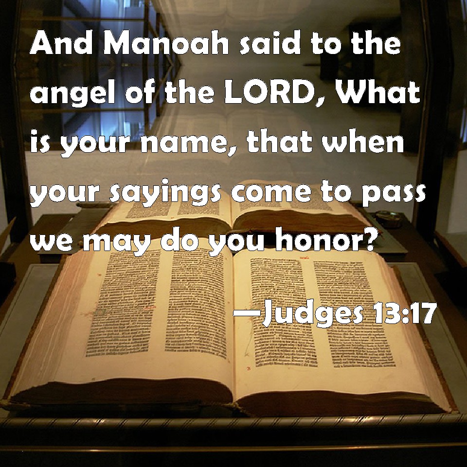 Choose a Background Judges 13:17 And Manoah said to the angel of the LORD, What is your name, that when your sayings come to pass we may do you honor? KJV: And Manoah said unto the angel of the LORD, What is thy name, that when thy sayings come to pass we may do thee honour? DRB: And he said to him: What is thy name, that, if thy word shall come to pass, we may honour thee? DBT: And Mano'ah said to the angel of the LORD, "What is your name, so that, when your words come true, we may honor you?" ERV: And Manoah said unto the angel of the LORD, What is thy name, that when thy words come to pass we may do thee honour? WBT: And Manoah said to the angel of the LORD, What is thy name, that when thy sayings come to pass, we may do thee honor? WEB: Manoah said to the angel of Yahweh, "What is your name, that when your words happen, we may honor you?" YLT: And Manoah saith unto the messenger of Jehovah, 'What is thy name? when thy words come to pass, then we have honoured thee.'Links Judges 13:17 NIV • Judges 13:17 NLT • Judges 13:17 ESV • Judges 13:17 NASB • Judges 13:17 KJV • Judges 13:17 Interlinear • Judges 13:17 Commentaries • Judges 13:17 Parallel Texts • Judges 13:17 Bible Apps • Judges 13:17 Parallel • Bible Hub |