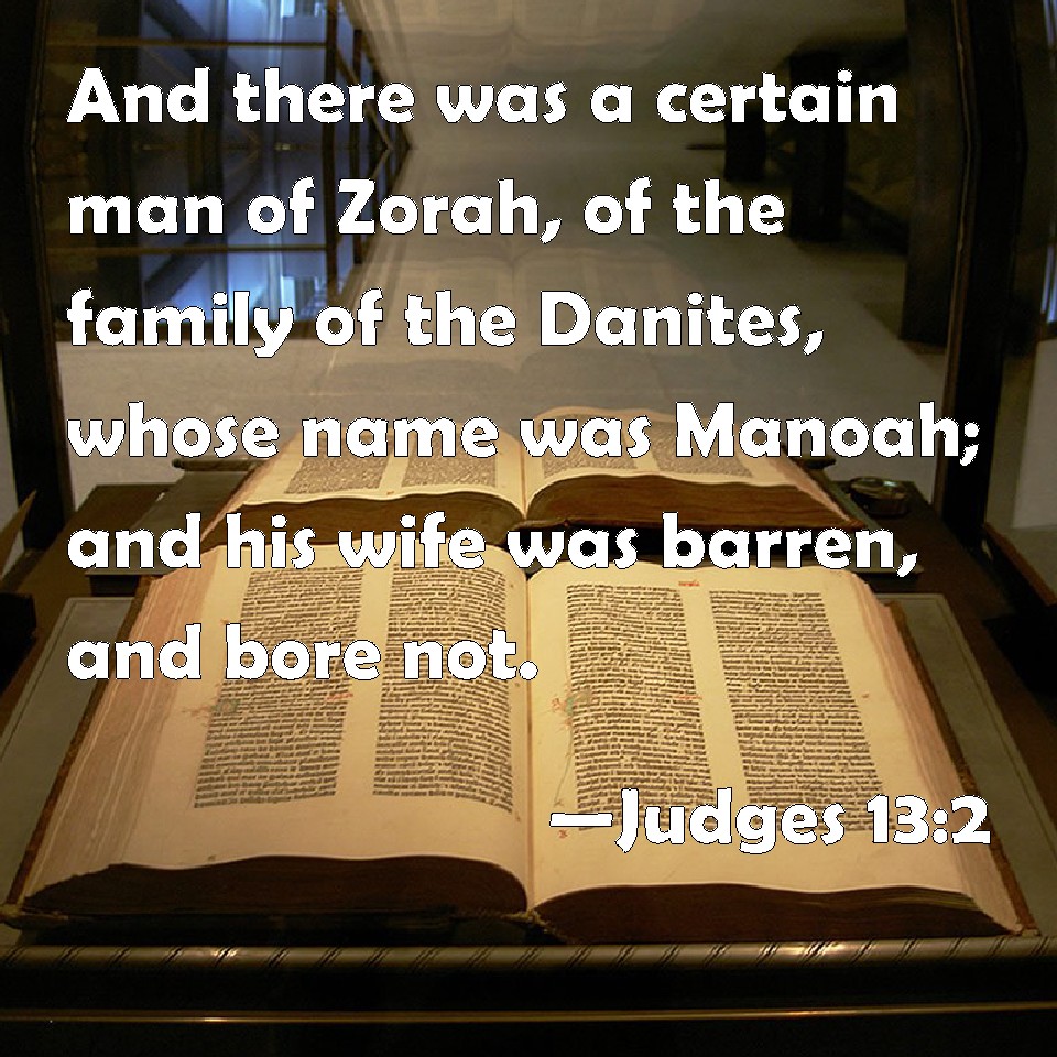 Choose a Background Judges 13:2 And there was a certain man of Zorah, of the family of the Danites, whose name was Manoah; and his wife was barren, and bore not. KJV: And there was a certain man of Zorah, of the family of the Danites, whose name was Manoah; and his wife was barren, and bare not. DRB: Now there was a certain man of Saraa, and of the race of Dan, whose name was Manue, and his wife was barren. DBT: And there was a certain man of Zorah, of the tribe of the Danites, whose name was Mano'ah; and his wife was barren and had no children. ERV: And there was a certain man of Zorah, of the family of the Danites, whose name was Manoah; and his wife was barren, and bare not. WBT: And there was a certain man of Zorah, of the family of the Danites, whose name was Manoah; and his wife was barren, and bore not. WEB: There was a certain man of Zorah, of the family of the Danites, whose name was Manoah; and his wife was barren, and didn't bear. YLT: And there is a certain man of Zorah, of the family of the Danite, and his name is Manoah, his wife is barren, and hath not borne;Links Judges 13:2 NIV • Judges 13:2 NLT • Judges 13:2 ESV • Judges 13:2 NASB • Judges 13:2 KJV • Judges 13:2 Interlinear • Judges 13:2 Commentaries • Judges 13:2 Parallel Texts • Judges 13:2 Bible Apps • Judges 13:2 Parallel • Bible Hub |