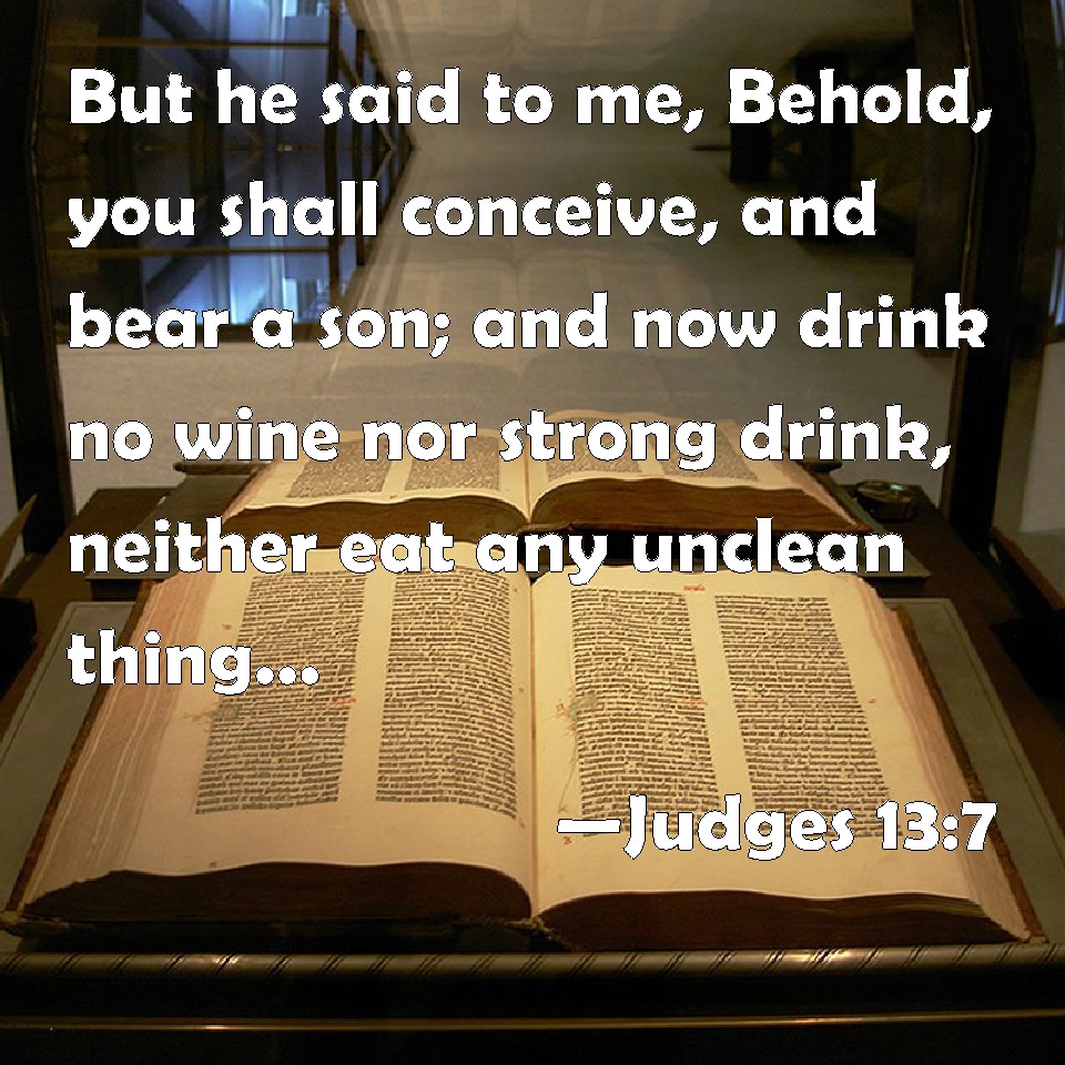 Choose a Background Judges 13:7 But he said to me, Behold, you shall conceive, and bear a son; and now drink no wine nor strong drink, neither eat any unclean thing: for the child shall be a Nazarite to God from the womb to the day of his death. KJV: But he said unto me, Behold, thou shalt conceive, and bear a son; and now drink no wine nor strong drink, neither eat any unclean thing: for the child shall be a Nazarite to God from the womb to the day of his death. DRB: But he answered thus: Behold thou shalt conceive and bear a son: beware thou drink no wine, nor strong drink, nor eat any unclean thing: for the child shall be a Nazarite of God from his infancy, from his mother's womb until the day of his death. DBT: but he said to me, 'Behold, you shall conceive and bear a son; so then drink no wine or strong drink, and eat nothing unclean, for the boy shall be a Nazirite to God from birth to the day of his death.'" ERV: but he said unto me, Behold, thou shalt conceive, and bear a son; and now drink no wine nor strong drink, and eat not any unclean thing: for the child shall be a Nazirite unto God from the womb to the day of his death. WBT: But he said to me, Behold, thou shalt conceive, and bear a son; and now drink no wine nor strong drink, neither eat any unclean thing: for the child shall be a Nazarite to God from his birth to the day of his death. WEB: but he said to me, 'Behold, you shall conceive, and bear a son; and now drink no wine nor strong drink, and eat not any unclean thing; for the child shall be a Nazirite to God from the womb to the day of his death.'" YLT: and he saith to me, Lo, thou art pregnant, and bearing a son, and now do not drink wine and strong drink, and do not eat any unclean thing, for a Nazarite to God is the youth from the womb till the day of his death.'Links Judges 13:7 NIV • Judges 13:7 NLT • Judges 13:7 ESV • Judges 13:7 NASB • Judges 13:7 KJV • Judges 13:7 Interlinear • Judges 13:7 Commentaries • Judges 13:7 Parallel Texts • Judges 13:7 Bible Apps • Judges 13:7 Parallel • Bible Hub |