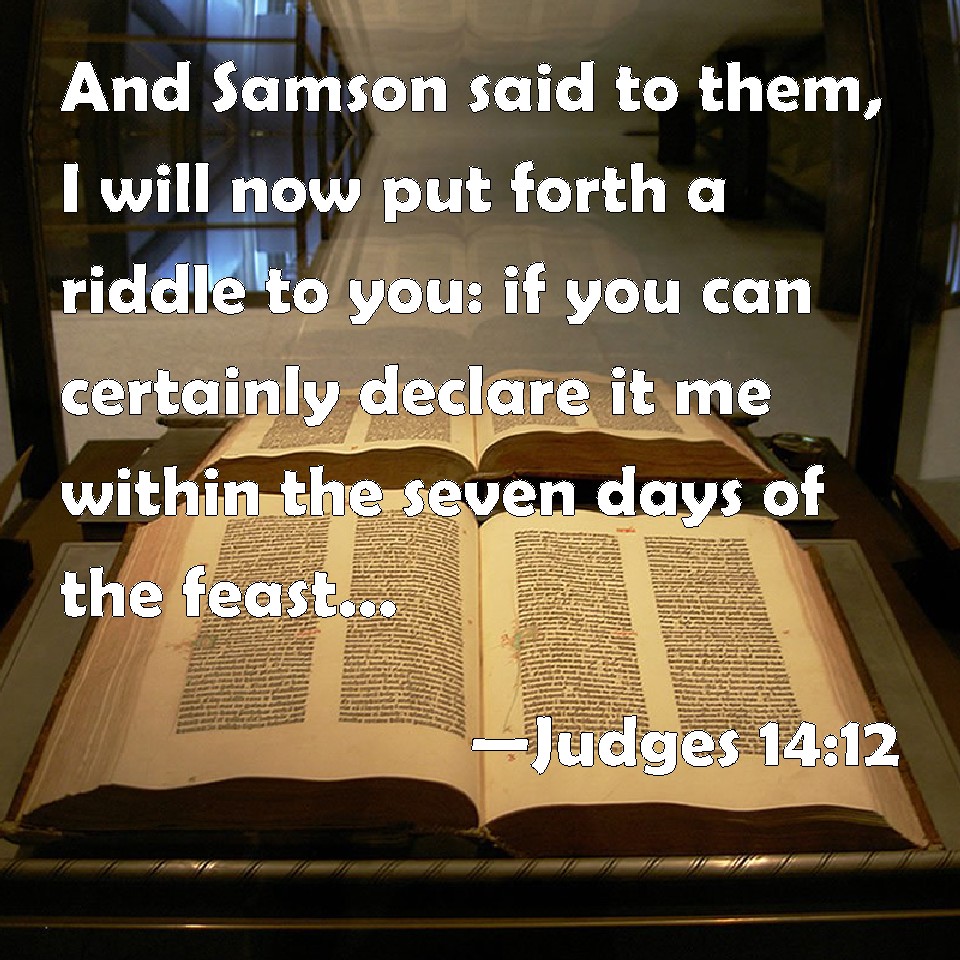 Choose a Background Judges 14:12 And Samson said to them, I will now put forth a riddle to you: if you can certainly declare it me within the seven days of the feast, and find it out, then I will give you thirty sheets and thirty change of garments: KJV: And Samson said unto them, I will now put forth a riddle unto you: if ye can certainly declare it me within the seven days of the feast, and find it out, then I will give you thirty sheets and thirty change of garments: DRB: And Samson said to them: I will propose to you a riddle, which if you declare unto me within the seven days of the feast, I will give you thirty shirts, and as many coats: DBT: And Samson said to them, "Let me now put a riddle to you; if you can tell me what it is, within the seven days of the feast, and find it out, then I will give you thirty linen garments and thirty festal garments; ERV: And Samson said unto them, Let me now put forth a riddle unto you: if ye can declare it me within the seven days of the feast, and find it out, then I will give you thirty linen garments and thirty changes of raiment: WBT: And Samson said to them, I will now propose a riddle to you: if ye can certainly declare it me within the seven days of the feast, and find it out, then I will give you thirty sheets and thirty change of garments: WEB: Samson said to them, "Let me tell you a riddle now. If you can declare it to me within the seven days of the feast, and find it out, then I will give you thirty linen garments and thirty changes of clothing; YLT: And Samson saith to them, 'Let me, I pray you, put forth to you a riddle; if ye certainly declare it to me in the seven days of the banquet, and have found it out, then I have given to you thirty linen shirts, and thirty changes of garments;Links Judges 14:12 NIV • Judges 14:12 NLT • Judges 14:12 ESV • Judges 14:12 NASB • Judges 14:12 KJV • Judges 14:12 Interlinear • Judges 14:12 Commentaries • Judges 14:12 Parallel Texts • Judges 14:12 Bible Apps • Judges 14:12 Parallel • Bible Hub |
