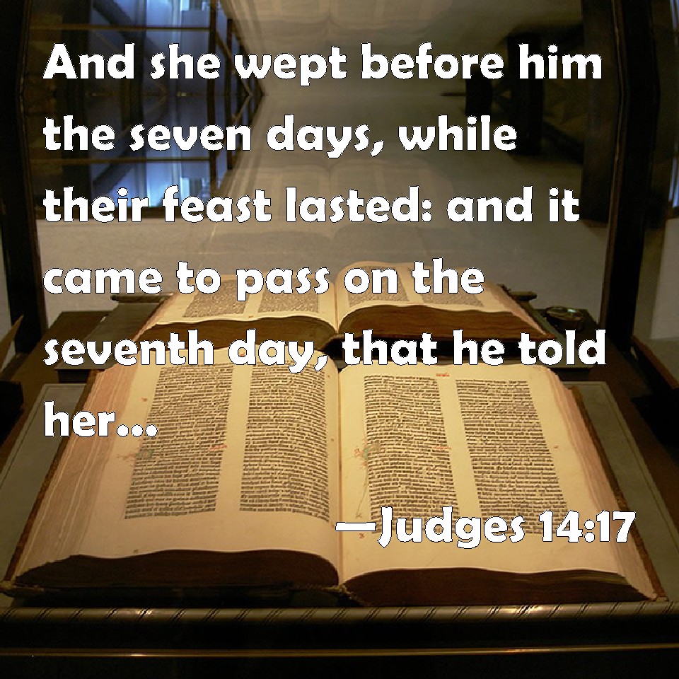 Choose a Background Judges 14:17 And she wept before him the seven days, while their feast lasted: and it came to pass on the seventh day, that he told her, because she lay sore on him: and she told the riddle to the children of her people. KJV: And she wept before him the seven days, while their feast lasted: and it came to pass on the seventh day, that he told her, because she lay sore upon him: and she told the riddle to the children of her people. DRB: So she wept before him the seven days of the feast: and at length on the seventh day as she was troublesome to him, he expounded it. And she immediately told her countrymen. DBT: She wept before him the seven days that their feast lasted; and on the seventh day he told her, because she pressed him hard. Then she told the riddle to her countrymen. ERV: And she wept before him the seven days, while their feast lasted: and it came to pass on the seventh day, that he told her, because she pressed him sore: and she told the riddle to the children of her people. WBT: And she wept before him the seven days, while their feast lasted: and it came to pass on the seventh day, that he told her, because she urged him: and she told the riddle to the children of her people. WEB: She wept before him the seven days, while their feast lasted: and it happened on the seventh day, that he told her, because she pressed him severely; and she told the riddle to the children of her people. YLT: And she weepeth for it the seven days in which their banquet hath been, and it cometh to pass on the seventh day that he declareth it to her, for she hath distressed him; and she declareth the riddle to the sons of her people.Links Judges 14:17 NIV • Judges 14:17 NLT • Judges 14:17 ESV • Judges 14:17 NASB • Judges 14:17 KJV • Judges 14:17 Interlinear • Judges 14:17 Commentaries • Judges 14:17 Parallel Texts • Judges 14:17 Bible Apps • Judges 14:17 Parallel • Bible Hub |