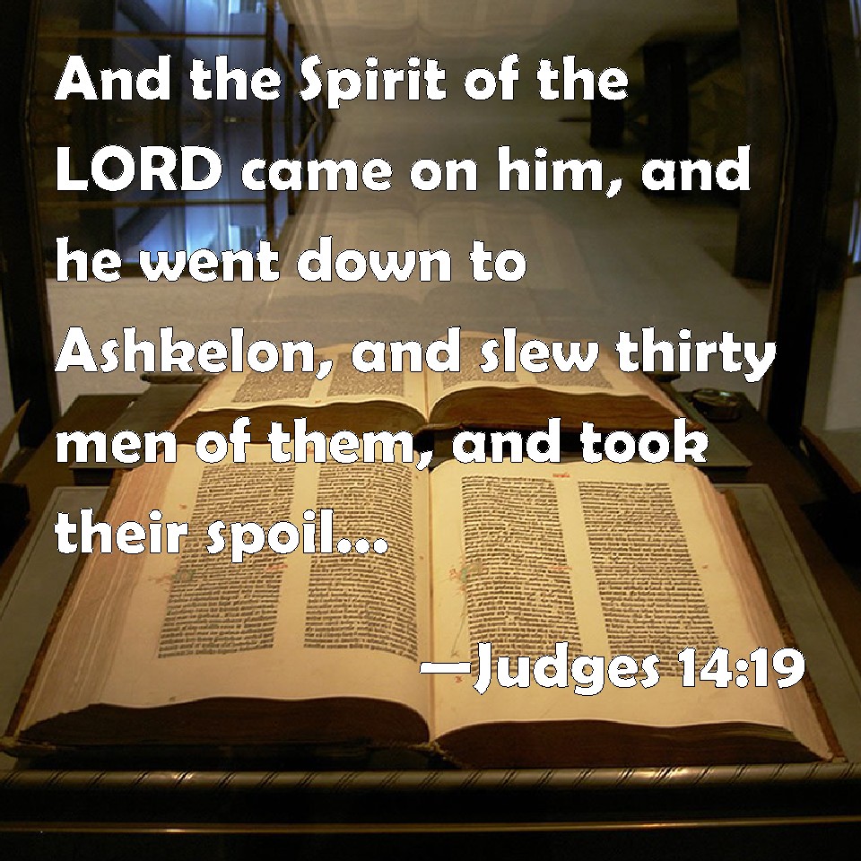 Choose a Background Judges 14:19 And the Spirit of the LORD came on him, and he went down to Ashkelon, and slew thirty men of them, and took their spoil, and gave change of garments to them which expounded the riddle. And his anger was kindled, and he went up to his father's house. KJV: And the Spirit of the LORD came upon him, and he went down to Ashkelon, and slew thirty men of them, and took their spoil, and gave change of garments unto them which expounded the riddle. And his anger was kindled, and he went up to his father's house. DRB: And the spirit of the Lord came upon him, and he went down to Ascalon, and slew there thirty men, whose garments he took away and gave to them that had declared the riddle. And being exceeding angry he went up to his father's house: DBT: And the Spirit of the LORD came mightily upon him, and he went down to Ash'kelon and killed thirty men of the town, and took their spoil and gave the festal garments to those who had told the riddle. In hot anger he went back to his father's house. ERV: And the spirit of the LORD came mightily upon him, and he went down to Ashkelon, and smote thirty men of them, and took their spoil, and gave the changes of raiment unto them that declared the riddle. And his anger was kindled, and he went up to his father's house. WBT: And the Spirit of the LORD came upon him, and he went down to Ashkelon, and slew thirty men of them, and took their spoil, and gave change of garments to them who expounded the riddle. And his anger was kindled, and he went up to his father's house. WEB: The Spirit of Yahweh came mightily on him, and he went down to Ashkelon, and struck thirty men of them, and took their spoil, and gave the changes [of clothing] to those who declared the riddle. His anger was kindled, and he went up to his father's house. YLT: And the Spirit of Jehovah prospereth over him, and he goeth down to Ashkelon, and smiteth of them thirty men, and taketh their armour, and giveth the changes to those declaring the riddle; and his anger burneth, and he goeth up to the house of his father;Links Judges 14:19 NIV • Judges 14:19 NLT • Judges 14:19 ESV • Judges 14:19 NASB • Judges 14:19 KJV • Judges 14:19 Interlinear • Judges 14:19 Commentaries • Judges 14:19 Parallel Texts • Judges 14:19 Bible Apps • Judges 14:19 Parallel • Bible Hub |