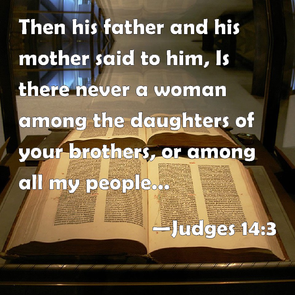 Choose a Background Judges 14:3 Then his father and his mother said to him, Is there never a woman among the daughters of your brothers, or among all my people, that you go to take a wife of the uncircumcised Philistines? And Samson said to his father, Get her for me; for she pleases me well. KJV: Then his father and his mother said unto him, Is there never a woman among the daughters of thy brethren, or among all my people, that thou goest to take a wife of the uncircumcised Philistines? And Samson said unto his father, Get her for me; for she pleaseth me well. DRB: And his father and mother said to him: Is there no woman among the daughters of thy brethren, or among all my people, that thou wilt take a wife of the Philistines, who are uncircumcised? And Samson said to his father: Take this woman for me, for she hath pleased my eyes. DBT: But his father and mother said to him, "Is there not a woman among the daughters of your kinsmen, or among all our people, that you must go to take a wife from the uncircumcised Philistines?" But Samson said to his father, "Get her for me; for she pleases me well." ERV: Then his father and his mother said unto him, Is there never a woman among the daughters of thy brethren, or among all my people, that thou goest to take a wife of the uncircumcised Philistines? And Samson said unto his father, Get her for me; for she pleaseth me well. WBT: Then his father and his mother said to him, Is there not a woman among the daughters of thy brethren, or among all my people, that thou goest to take a wife of the uncircumcised Philistines? And Samson said to his father, Get her for me; for she pleaseth me well. WEB: Then his father and his mother said to him, "Is there never a woman among the daughters of your brothers, or among all my people, that you go to take a wife of the uncircumcised Philistines?" Samson said to his father, "Get her for me; for she pleases me well." YLT: And his father saith to him — also his mother, 'Is there not among the daughters of thy brethren, and among all my people, a woman, that thou art going to take a woman from the uncircumcised Philistines?' and Samson saith unto his father, 'Take her for me, for she is right in mine eyes.'Links Judges 14:3 NIV • Judges 14:3 NLT • Judges 14:3 ESV • Judges 14:3 NASB • Judges 14:3 KJV • Judges 14:3 Interlinear • Judges 14:3 Commentaries • Judges 14:3 Parallel Texts • Judges 14:3 Bible Apps • Judges 14:3 Parallel • Bible Hub |