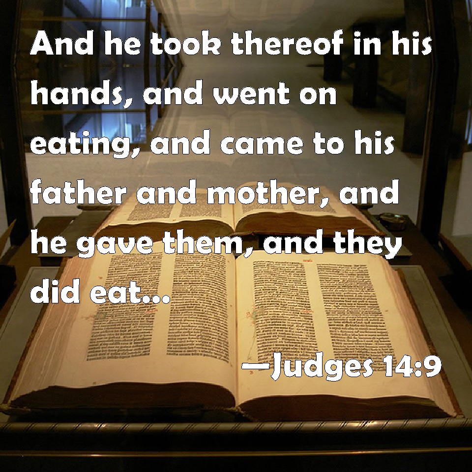 Choose a Background Judges 14:9 And he took thereof in his hands, and went on eating, and came to his father and mother, and he gave them, and they did eat: but he told not them that he had taken the honey out of the carcass of the lion. KJV: And he took thereof in his hands, and went on eating, and came to his father and mother, and he gave them, and they did eat: but he told not them that he had taken the honey out of the carcase of the lion. DRB: And when be had taken it in his hands, he went on eating: and coming to his father and mother, he gave them of it, and they ate: but he would not tell them, that he had taken the honey from the body of the lion. DBT: He scraped it out into his hands, and went on, eating as he went; and he came to his father and mother, and gave some to them, and they ate. But he did not tell them that he had taken the honey from the carcass of the lion. ERV: And he took it into his hands, and went on, eating as he went, and he came to his father and mother, and gave unto them, and they did eat: but he told them not that he had taken the honey out of the body of the lion. WBT: And he took of it in his hands, and went on eating, and came to his father and mother, and he gave them, and they ate: but he told them not that he had taken the honey out of the carcass of the lion. WEB: He took it into his hands, and went on, eating as he went; and he came to his father and mother, and gave to them, and they ate: but he didn't tell them that he had taken the honey out of the body of the lion. YLT: And he taketh it down on to his hands, and goeth on, going and eating; and he goeth unto his father, and unto his mother, and giveth to them, and they eat, and he hath not declared to them that from the body of the lion he took down the honey.Links Judges 14:9 NIV • Judges 14:9 NLT • Judges 14:9 ESV • Judges 14:9 NASB • Judges 14:9 KJV • Judges 14:9 Interlinear • Judges 14:9 Commentaries • Judges 14:9 Parallel Texts • Judges 14:9 Bible Apps • Judges 14:9 Parallel • Bible Hub |