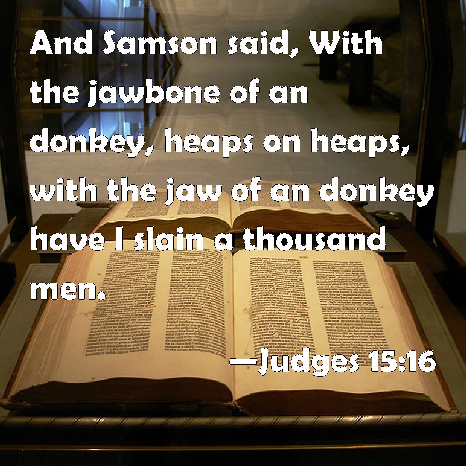 Choose a Background Judges 15:16 And Samson said, With the jawbone of an ass, heaps on heaps, with the jaw of an ass have I slain a thousand men. KJV: And Samson said, With the jawbone of an ass, heaps upon heaps, with the jaw of an ass have I slain a thousand men. DRB: And he said: With the jawbone of an ass, with the jaw of the colt of asses I have destroyed them, and have slain a thousand men. DBT: And Samson said, "With the jawbone of an ass, heaps upon heaps, with the jawbone of an ass have I slain a thousand men." ERV: And Samson said, With the jawbone of an ass, heaps upon heaps, with the jawbone of an ass have I smitten a thousand men. WBT: And Samson said, With the jaw-bone of an ass, heaps upon heaps, with the jaw of an ass have I slain a thousand men. WEB: Samson said, "With the jawbone of a donkey, heaps on heaps; with the jawbone of a donkey I have struck a thousand men." YLT: And Samson saith, 'With a jaw-bone of the ass — an ass upon asses — with a jaw-bone of the ass I have smitten a thousand men.'Links Judges 15:16 NIV • Judges 15:16 NLT • Judges 15:16 ESV • Judges 15:16 NASB • Judges 15:16 KJV • Judges 15:16 Interlinear • Judges 15:16 Commentaries • Judges 15:16 Parallel Texts • Judges 15:16 Bible Apps • Judges 15:16 Parallel • Bible Hub |