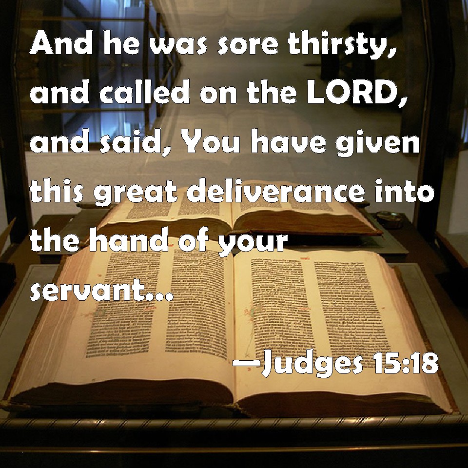 Choose a Background Judges 15:18 And he was sore thirsty, and called on the LORD, and said, You have given this great deliverance into the hand of your servant: and now shall I die for thirst, and fall into the hand of the uncircumcised? KJV: And he was sore athirst, and called on the LORD, and said, Thou hast given this great deliverance into the hand of thy servant: and now shall I die for thirst, and fall into the hand of the uncircumcised? DRB: Arid being very thirsty, he cried to the Lord, and said: Thou hast given this very great deliverance and victory into the hand of thy servant: and behold I die for thirst, and shall fall into the hands of the uncircumcised. DBT: And he was very thirsty, and he called on the LORD and said, "Thou hast granted this great deliverance by the hand of thy servant; and shall I now die of thirst, and fall into the hands of the uncircumcised?" ERV: And he was sore athirst, and called on the LORD, and said, Thou hast given this great deliverance by the hand of thy servant: and now shall I die for thirst, and fall into the hand of the uncircumcised. WBT: And he was very thirsty, and called on the LORD, and said, Thou hast given this great deliverance into the hand of thy servant: and now shall I die by thirst, and fall into the hand of the uncircumcised? WEB: He was very thirsty, and called on Yahweh, and said, "You have given this great deliverance by the hand of your servant; and now shall I die for thirst, and fall into the hand of the uncircumcised?" YLT: and he thirsteth exceedingly, and calleth unto Jehovah, and saith, 'Thou — Thou hast given by the hand of Thy servant this great salvation; and now, I die with thirst, and have fallen into the hand of the uncircumcised.'Links Judges 15:18 NIV • Judges 15:18 NLT • Judges 15:18 ESV • Judges 15:18 NASB • Judges 15:18 KJV • Judges 15:18 Interlinear • Judges 15:18 Commentaries • Judges 15:18 Parallel Texts • Judges 15:18 Bible Apps • Judges 15:18 Parallel • Bible Hub |