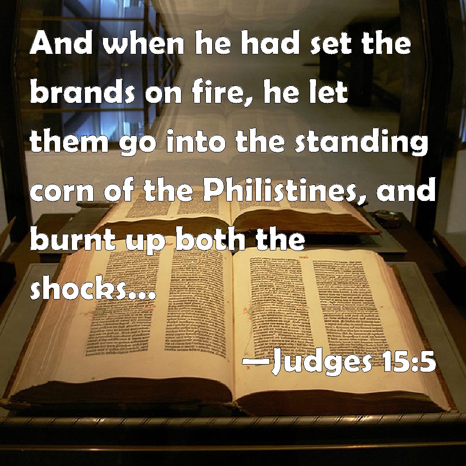 Choose a Background Judges 15:5 And when he had set the brands on fire, he let them go into the standing corn of the Philistines, and burnt up both the shocks, and also the standing corn, with the vineyards and olives. KJV: And when he had set the brands on fire, he let them go into the standing corn of the Philistines, and burnt up both the shocks, and also the standing corn, with the vineyards and olives. DRB: And setting them on fire he let the foxes go, that they might run about hither and thither. And they presently went into the standing corn of the Philistines. Which being set on fire, both the corn that was already carried together, and that which was yet standing, was all burnt, insomuch, that the flame consumed also the vineyards and the oliveyards. DBT: And when he had set fire to the torches, he let the foxes go into the standing grain of the Philistines, and burned up the shocks and the standing grain, as well as the olive orchards. ERV: And when he had set the brands on fire, he let them go into the standing corn of the Philistines, and burnt up both the shocks and the standing corn, and also the oliveyards. WBT: And when he had set the brands on fire, he let them go into the standing corn of the Philistines, and burnt up both the shocks and also the standing corn, with the vineyards and olives. WEB: When he had set the brands on fire, he let them go into the standing grain of the Philistines, and burnt up both the shocks and the standing grain, and also the olive groves. YLT: and kindleth fire in the torches, and sendeth them out into the standing corn of the Philistines, and burneth it from heap even unto standing corn, even unto vineyard — olive-yard.Links Judges 15:5 NIV • Judges 15:5 NLT • Judges 15:5 ESV • Judges 15:5 NASB • Judges 15:5 KJV • Judges 15:5 Interlinear • Judges 15:5 Commentaries • Judges 15:5 Parallel Texts • Judges 15:5 Bible Apps • Judges 15:5 Parallel • Bible Hub |