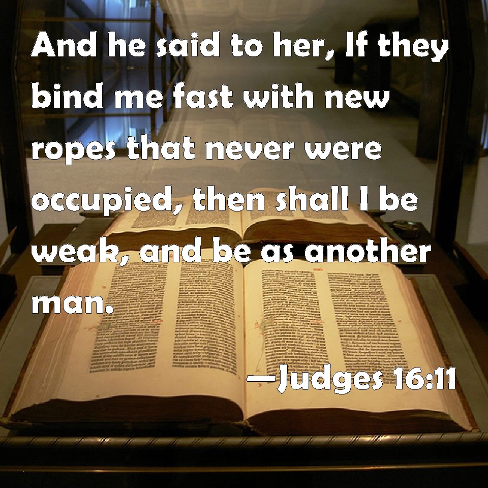 Choose a Background Judges 16:11 And he said to her, If they bind me fast with new ropes that never were occupied, then shall I be weak, and be as another man. KJV: And he said unto her, If they bind me fast with new ropes that never were occupied, then shall I be weak, and be as another man. DRB: And he answered her: If I shall be bound with new ropes, that were never in work, I shall be weak and like other men. DBT: And he said to her, "If they bind me with new ropes that have not been used, then I shall become weak, and be like any other man." ERV: And he said unto her, If they only bind me with new ropes wherewith no work hath been done, then shall I become weak, and be as another man. WBT: And he said to her, If they bind me fast with new ropes that never were used, then shall I be weak, and be as another man. WEB: He said to her, "If they only bind me with new ropes with which no work has been done, then shall I become weak, and be as another man." YLT: And he saith unto her, 'If they certainly bind me with thick bands, new ones, by which work hath not been done, then I have been weak, and have been as one of the human race.'Links Judges 16:11 NIV • Judges 16:11 NLT • Judges 16:11 ESV • Judges 16:11 NASB • Judges 16:11 KJV • Judges 16:11 Interlinear • Judges 16:11 Commentaries • Judges 16:11 Parallel Texts • Judges 16:11 Bible Apps • Judges 16:11 Parallel • Bible Hub |