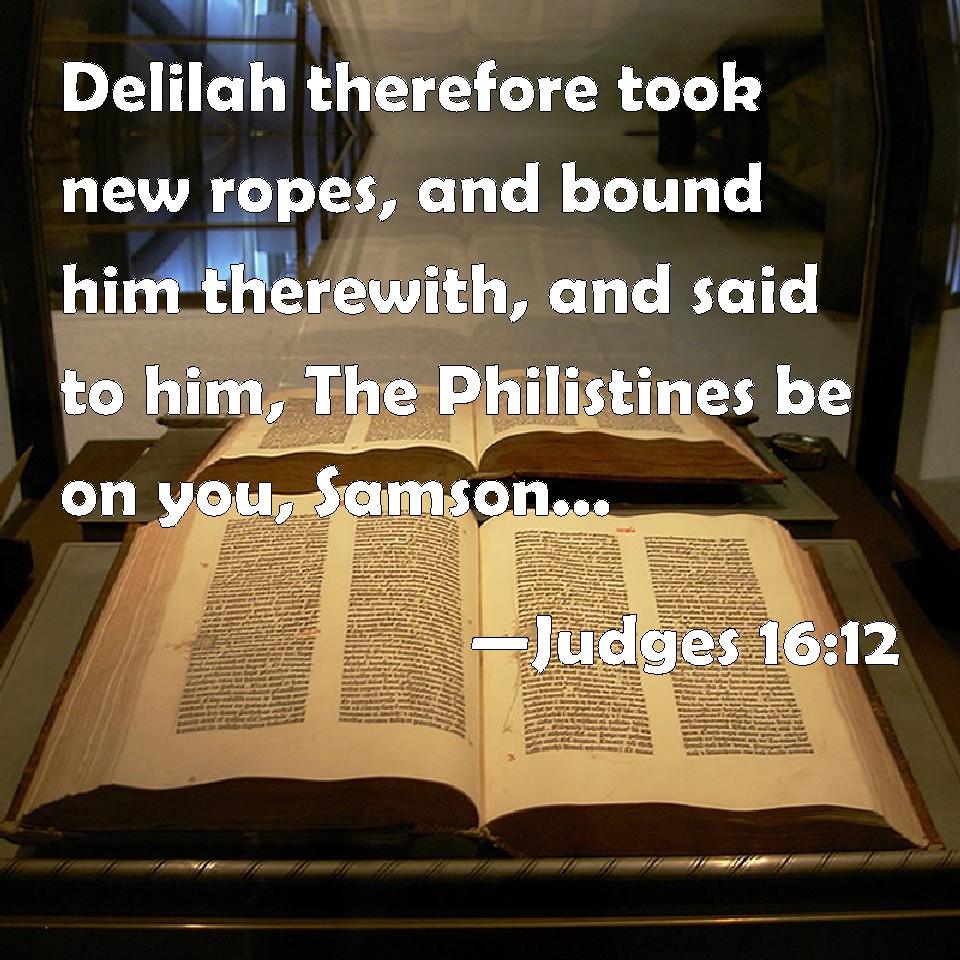 Choose a Background Judges 16:12 Delilah therefore took new ropes, and bound him therewith, and said to him, The Philistines be on you, Samson. And there were liers in wait abiding in the chamber. And he broke them from off his arms like a thread. KJV: Delilah therefore took new ropes, and bound him therewith, and said unto him, The Philistines be upon thee, Samson. And there were liers in wait abiding in the chamber. And he brake them from off his arms like a thread. DRB: Dalila bound him again with these, and cried out: The Philistines are upon thee, Samson, there being an ambush prepared for him in the chamber. But he broke the bands like threads of webs. DBT: So Deli'lah took new ropes and bound him with them, and said to him, "The Philistines are upon you, Samson!" And the men lying in wait were in an inner chamber. But he snapped the ropes off his arms like a thread. ERV: So Delilah took new ropes, and bound him therewith, and said unto him, The Philistines be upon thee, Samson. And the liers in wait were abiding in the inner chamber. And he brake them from off his arms like a thread. WBT: Delilah therefore took new ropes, and bound him with them, and said to him, The Philistines are upon thee, Samson. (And there were liers in wait abiding in the chamber.) And he broke them from off his arms like a thread. WEB: So Delilah took new ropes, and bound him therewith, and said to him, "The Philistines are on you, Samson!" The ambush was waiting in the inner room. He broke them off his arms like a thread. YLT: And Delilah taketh thick bands, new ones, and bindeth him with them, and saith unto him, 'Philistines are upon thee, Samson;' and the ambush is abiding in an inner chamber, and he breaketh them from off his arms as a thread.Links Judges 16:12 NIV • Judges 16:12 NLT • Judges 16:12 ESV • Judges 16:12 NASB • Judges 16:12 KJV • Judges 16:12 Interlinear • Judges 16:12 Commentaries • Judges 16:12 Parallel Texts • Judges 16:12 Bible Apps • Judges 16:12 Parallel • Bible Hub |