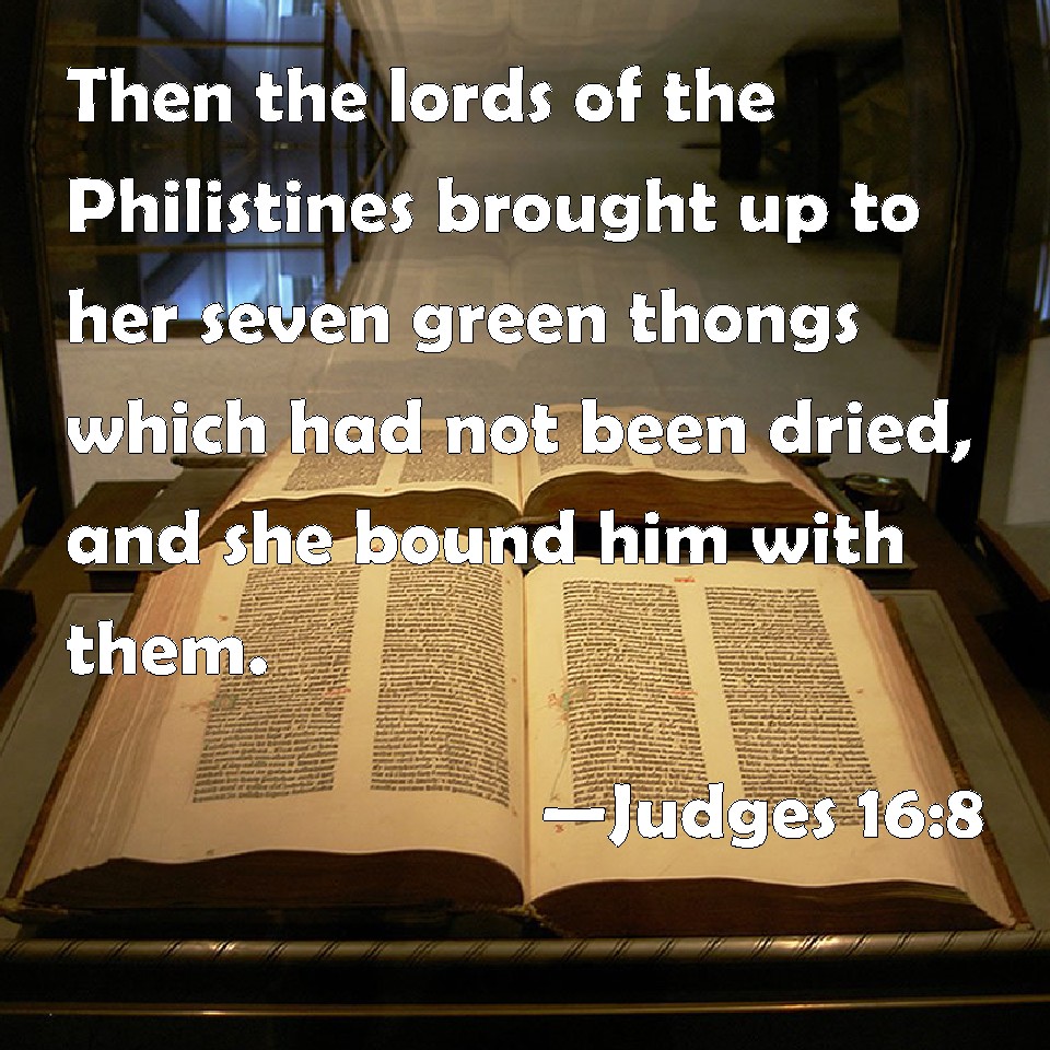 Choose a Background Judges 16:8 Then the lords of the Philistines brought up to her seven green thongs which had not been dried, and she bound him with them. KJV: Then the lords of the Philistines brought up to her seven green withs which had not been dried, and she bound him with them. DRB: And the princes of the Philistines brought unto her seven cords, such is he spoke of, with which she bound him; DBT: Then the lords of the Philistines brought her seven fresh bowstrings which had not been dried, and she bound him with them. ERV: Then the lords of the Philistines brought up to her seven green withes which had not been dried, and she bound him with them. WBT: Then the lords of the Philistines brought to her seven green withs, which had not been dried, and she bound him with them. WEB: Then the lords of the Philistines brought up to her seven green cords which had not been dried, and she bound him with them. YLT: And the princes of the Philistines bring up to her seven green withs which have not been dried, and she bindeth him with them.Links Judges 16:8 NIV • Judges 16:8 NLT • Judges 16:8 ESV • Judges 16:8 NASB • Judges 16:8 KJV • Judges 16:8 Interlinear • Judges 16:8 Commentaries • Judges 16:8 Parallel Texts • Judges 16:8 Bible Apps • Judges 16:8 Parallel • Bible Hub |